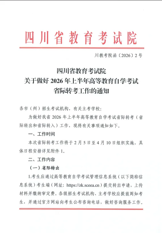 >自考 | 四川省2026年上半年自学考试省际转考相关通知
