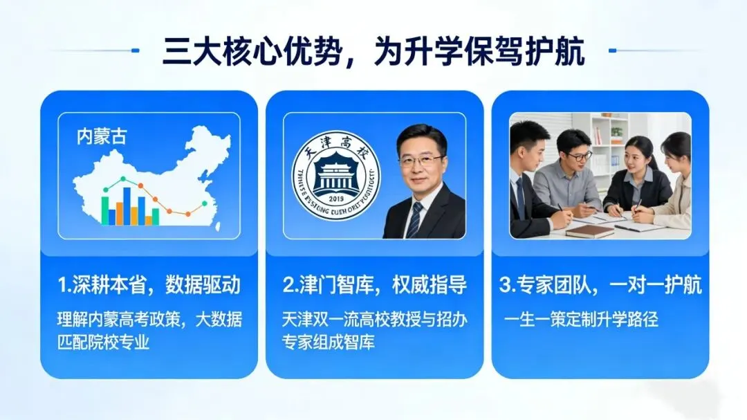 独家整合天津“双一流”高校教授与招办专家组成“津门智库”,打破地域之间的信息壁垒。为学子们带来前沿专业解读、内部招生视角,针对性优化升学路径,让内蒙学子也能同步享有顶尖教育资源的赋能。