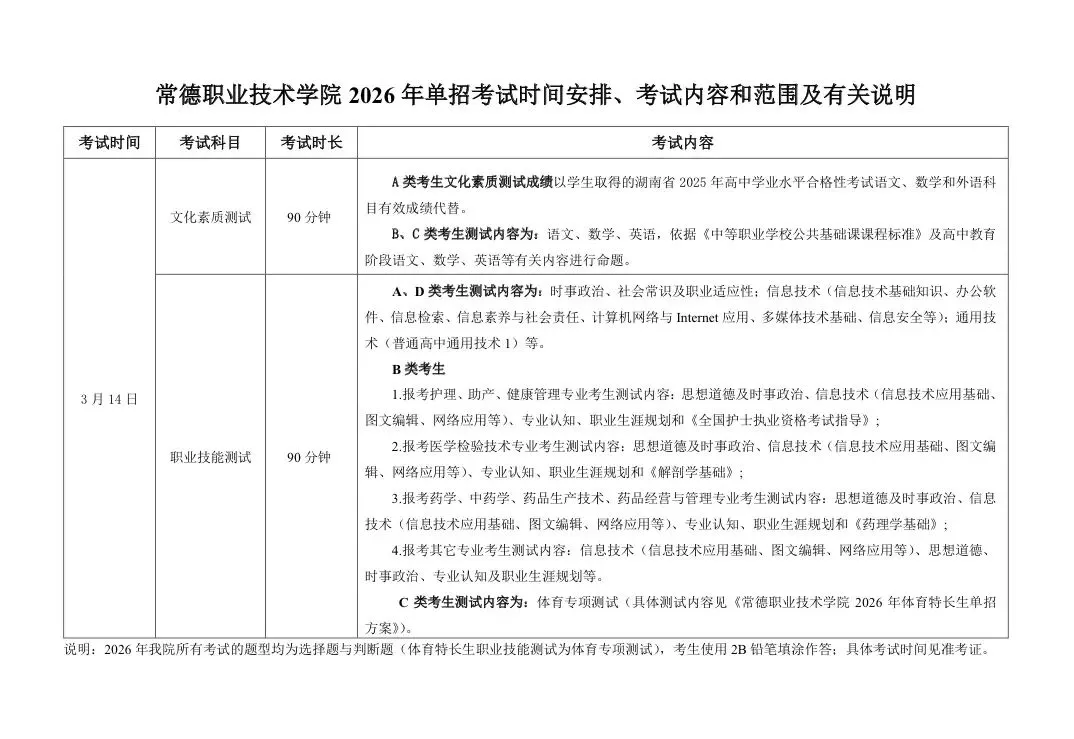 常德职业技术学院2026年单招考试内容及范围