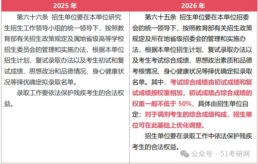 2026年研招规定明确规定:初试成绩占综合成绩的权重一般不低于50%,具体由招生单位自定