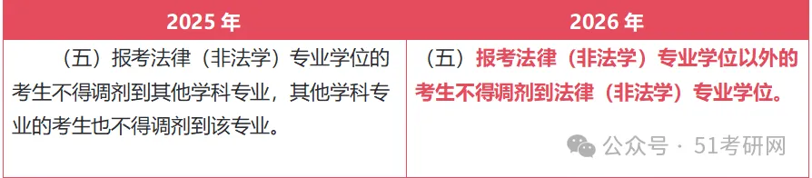 2025年是双向禁止(法律(非法学)考生出不去,其他考生也进不来)。2026年新表述仅单向禁止了外部考生调入,但未明确禁止法律(非法学)考生调剂到其他专业。这或许说明法律(非法学)考生在符合条件时调剂至其他相近专业的潜在可能性。但最终要以招生单位的调剂要求为准。