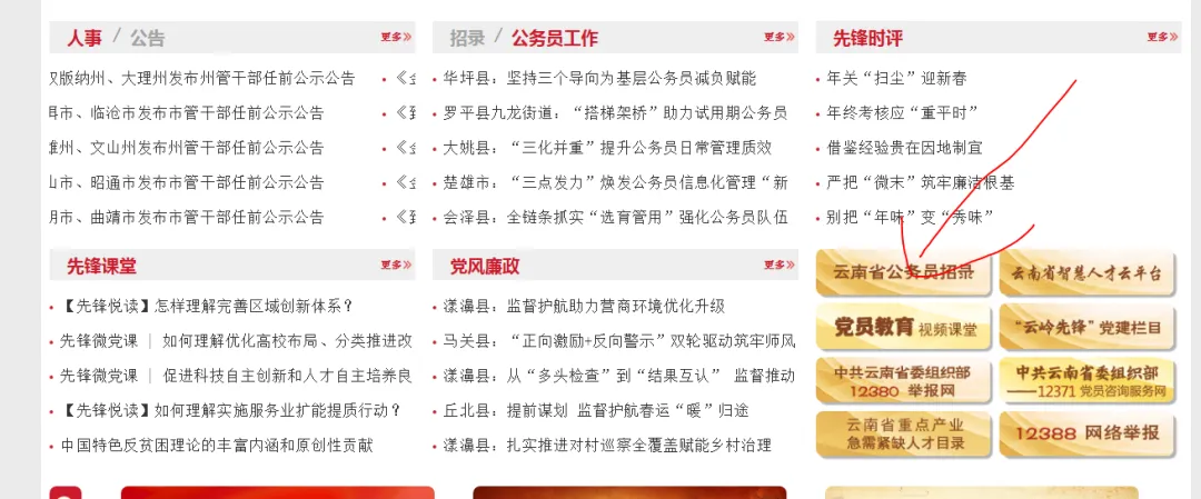 (一)本次招考指定网站为云岭先锋网“云南省公务员招录”专栏(https://ylxf.1237125.cn/TopicWeb/ynskslygwy/index.html)。本次招考不委托任何机构或个人对外发布招考信息,请广大报考者切勿轻信任何冠以“内部消息”、“独家渠道”等有关招考信息,避免上当受骗。因查看其他渠道的错误信息影响考试或造成个人信息泄露的,由报考者自行负责。