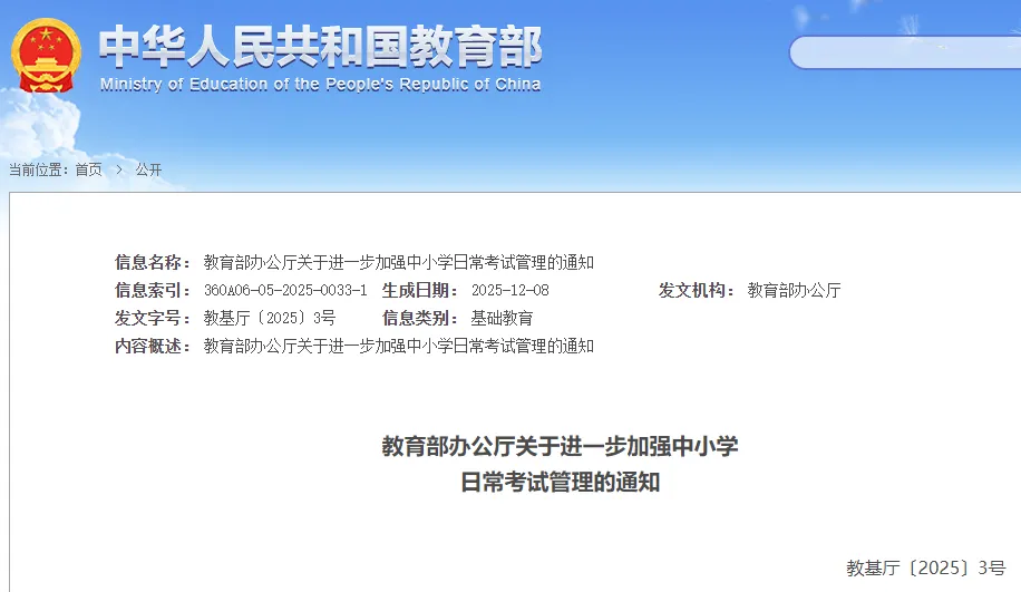 中小学日常考试,是指地方和学校在日常教学过程中,为了检验学生阶段性学习效果、服务于教学改进而面向年级全体学生组织实施的考试,不含初高中学业水平考试和普通高等学校招生全国统一考试。为贯彻落实《教育强国建设规划纲要(2024—2035年)》和三年行动计划及深化“双减”改革有关部署要求,切实解决部分地方和学校日常考试存在的管理松散、次数偏多、命题质量不高、审查不严、教考脱节等问题,减少日常考试测试频次,提升日常考试质量,强化考试安全风险防范,减轻学生过重学业负担,促进学生全面健康发展,现就进一步加强中小学日常考试管理提出以下要求。