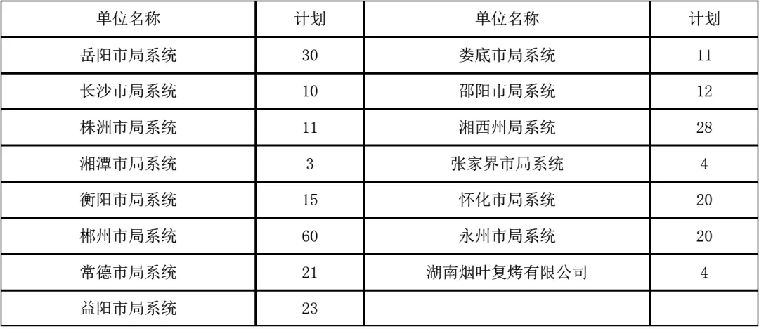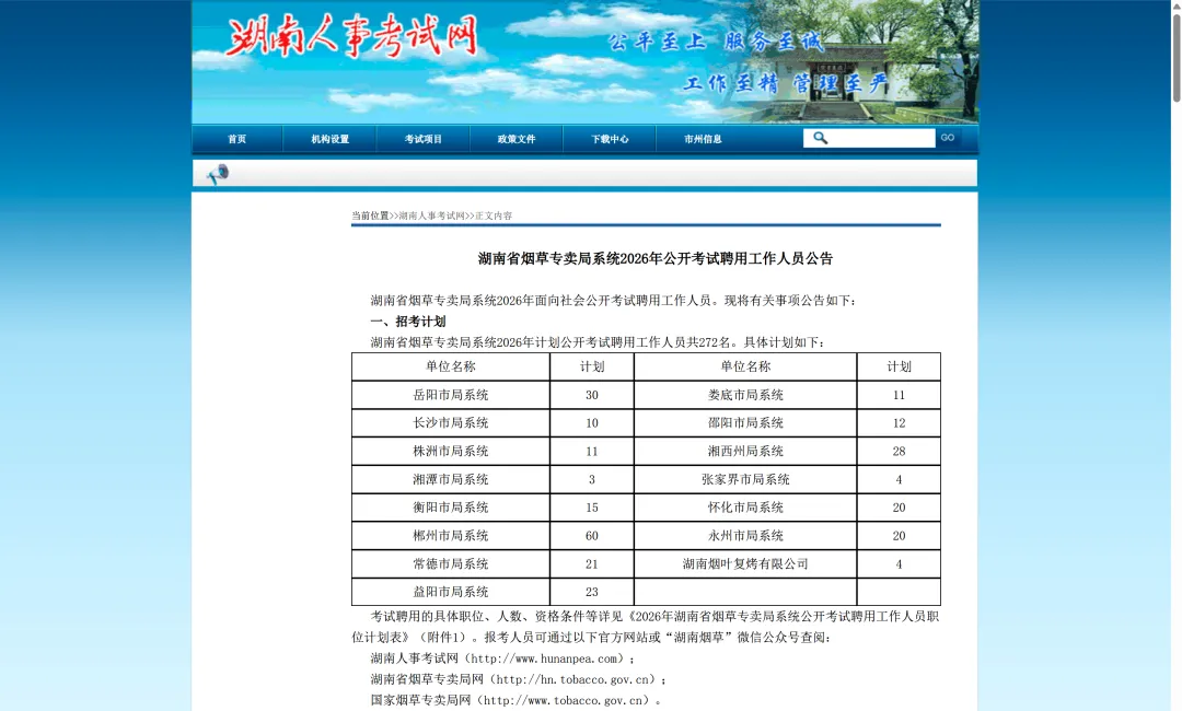 湖南省烟草专卖局系统 2026 年面向社会公开考试聘用工作人员。现将有关事项公告如下:湖南省烟草专卖局系统 2026 年计划公开考试聘用工作人员共 272 名。具体计划如下: 考试聘用的具体职位、人数、资格条件等详见《2026 年湖南省烟草专卖局系统公开考试聘用工作人员职位计划表》(附件 1)。报考人员可通过以下官方网站或 “湖南烟草” 微信公众号查阅:湖南人事考试网(http://www.hunanpea.com);湖南省烟草专卖局网(http://hn.tobacco.gov.cn);国家烟草专卖局网(http://www.tobacco.gov.cn)。2. 拥护中华人民共和国宪法,拥护中国共产党领导和社会主义制度。3. 年龄在 18 周岁以上、35 周岁以下(即在 1990 年 1 月至 2008 年 1 月期间出生)。6. 具备符合招考职位要求的学历、专业和工作能力。报考人员应取得毕业证书且为国家承认的学历(学位),结业证书、肄业证书等不符合要求。对有疑义的国民教育学历(学位),以省以上教育行政部门认定的结果为准;对有疑义的党校学历(学位),以省委组织部协调相关业务主管部门认定的结果为准。报考人员的专业应严格按照毕业证书填写。所学专业已列入《湖南省 2026 年考试录用公务员专业指导目录》(附件 2)、但未列入招考职位所需专业的,不符合报考条件;所学专业未列入《湖南省 2026 年考试录用公务员专业指导目录》的,是否符合招考职位专业要求,由招聘单位综合研判认定。具有较高学历人员报考学历要求较低的职位时,须符合该职位所需学历对应的专业要求。报考人员必须为通过全国统一的高考或研究生入学考试(含自主招生、单独招生等),在国内普通高等学校或承担研究生教育任务的科学研究机构就读,且就读期间个人档案保管在就读院校(或科研机构),于 2025 年 8 月 1 日至 2026 年 7 月 31 日期间毕业的学生。(1)2025 年 8 月 1 日至 2026 年 7 月 31 日期间取得国(境)外学历(学位)并于 2026 年 9 月 30 日前完成教育部门学历认证的留学回国人员。(2)列入国家统一招生计划,通过本科院校自主招生、高职院校单独招生、免试推荐入学就读的 2026 届普通高校毕业生,以及通过高校专升本考试、5 年制高职入学就读的 2026 届普通高校毕业生。(3)根据《关于在普通高校继续开展第二学士学位教育的通知》(教高厅函〔2020〕9 号)的有关要求,按规定录取、全日制学习攻读第二学士学位,并纳入高校学籍管理系统,于 2025 年 8 月 1 日至 2026 年 7 月 31 日期间以第二学士学位毕业的学生。(4)2025 年 8 月 1 日以后退出现役的入伍大学毕业生。8. 符合烟草行业和湖南省烟草专卖局系统招聘回避管理规定。如在招聘过程中直至录用后发现存在不符合招聘回避管理规定的,取消聘用资格。4. 在各级公务员招考或湖南省烟草专卖局系统面向社会公开考试聘用工作人员考试中被认定有舞弊等严重违反录用纪律行为的人员。6. 被辞退未满 5 年的公务员或参照公务员法管理的机关(单位)工作人员。8. 在读的普通高校非 2026 届毕业生(在读的非 2026 届研究生不能以本科等学历报考,其他情形依此类推)。9.2024 年 1 月 1 日以后,参加公务员考试或湖南省烟草专卖局系统面向社会公开招聘考试进入录用或聘用公示阶段后放弃的人员,办理了公务员录用审批手续后取消录用或离职的人员,被湖南省烟草专卖局系统面向社会公开招聘考试取消聘用资格的人员。10. 曾有学术不端等不良行为或在校期间受过院系级(含)以上单位处分的人员。11. 存在法律法规规定不得录用为公务员的其他情形的人员。2026 届普通高校毕业生和留学回国人员应于 2026 年 7 月 31 日前取得相应学历(学位)证书,其中留学回国人员应于 2026 年 9 月 30 日前取得相应国(境)外学历认证。参加 2025 年国家统一法律职业资格考试取得合格成绩但尚未取得法律职业资格证书(A 证)的考生可先行报考要求取得《法律职业资格证书》(A 证)的职位。招聘公告和职位表中其他未明确时限的报考资格条件(如政治面貌、学历、学位、服务期限、辞退等),计算截止时间均为公告发布之日(2026 年 1 月 14 日)。1. 网上注册的时间和网站。2026 年 1 月 29 日 9:00 至 2 月 5 日 17:00,报考人员登录湖南人事考试网,进行网上注册。2. 注册的要求和注意事项。报考人员用本人身份证号和本人手机号进行注册。一个身份证号对应一个手机号,只能注册一次。报考人员在注册前应仔细阅读本公告,注册信息应当真实、准确、完整,并对其负完全责任。未进行注册的报考人员不能进行网上报名。注册信息提交后,不得修改。注册及实名认证具体操作程序:①填写信息。使用电脑登录湖南人事考试网(www.hunanpea.com)网上报名服务平台,填写姓名、身份证号码、手机号码、短信验证码、设置登录密码、设置实名照片,勾选同意《用户服务协议》并提交。②实名认证。勾选 “本人确认以上信息无误并继续注册” 后,提交实名认证信息,认证成功后完成注册。③账号登录。输入注册身份证号码、登录密码,滑动验证后进行账号登录。未在网上报名服务平台注册过的报考人员,须按照公告要求提前完成注册及实名认证。3. 报考人员和有关单位、人员提供的涉及报考资格的材料或信息不实的,取消本次报考资格。恶意注册报名信息、扰乱报名秩序或伪造学历证明及其他有关材料骗取考试资格的,取消本次报考资格,并记入湖南省烟草专卖局系统公开考