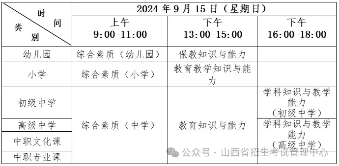 根据教育部和省教育厅有关规定,现将山西省2024年下半年中小学教师资格考试笔试有关事项公告如下:1.考生在报考前应认真阅读本公告,了解相关要求及报名条件后再履行报名程序,如实准确填写个人基本信息,并对填写的信息及提供的材料的真实性、准确性、有效性负责。如因不符合报考条件、不了解报名程序、填写信息错误等原因造成考试、认定等后续环节不能完成,后果由考生本人承担。考生不得委托他人代理报名。2.考生在考试机构尚未进行审核前可对本人的报名信息进行多次修改,审核通过后,所有信息不得更改。请考生提交报名信息前仔细核对个人填写的信息。3.考生应选择“户籍所在地”或“居住证申领地”报名参加考试,高校在校生也可以选择在“在读学校所在地”报考。“晋中市高校园区”考区仅接收高校园区内各高校在校生报名。4.报名条件中的“学历”指的是国民教育系列的学历,包括普通高校、成人高校、自学考试等各类国家承认的学历。1.遵守宪法和法律,热爱教育事业,具有良好的思想品德。2.符合山西省教育厅公布的申请认定教师资格的体检标准。3.未达到国家法定退休年龄,户籍、在读学校在我省或持有我省公安机关签发的有效期内的居民居住证的中国公民;驻晋部队现役军人和现役武警;持有我省公安机关签发的有效期内的港澳台居民居住证、港澳居民来往内地通行证、五年有效期的台湾居民来往大陆通行证。4.申请幼儿园教师资格,应当具备幼儿师范学校师范类专业毕业及以上学历;申请小学教师资格,应当具备大学专科毕业及以上学历;申请初级中学、高级中学和中等职业学校教师资格,应当具备大学本科毕业及以上学历。5.山西省全日制普通高校三年级及以上在校生、幼儿师范学校师范类专业三年级在校生、两年制专科二年级在校生、五年制高职(五年一贯制、三二分段)五年级在校生、专升本一年级及以上在校生、全日制研究生各年级在校生,可以报名参加本次教师资格考试,其他年级在校生不得报名;就读于成人教育(自学考试、电大、夜大、函授)、网络教育的人员须毕业并取得国民教育系列学历。6.被撤销教师资格的人员,5年内不得报名;受到剥夺政治权利,或故意犯罪受到有期徒刑以上刑事处罚的,不得报名;参加教师资格考试有作弊行为,按照《教师资格条例》被处以3年内不得报名参加考试的人员在处罚期内不得报名。1.网上报名时间:2024年7月5日-8日17:00; 2.网上审核时间:2024年7月6日-9日17:00;3.网上缴费截止时间:2024年7月10日24:00;4.准考证下载打印时间:2024年9月9日-15日;1.凡符合报考条件的考生,登录“中小学教师资格考试网”(http://ntce.neea.edu.cn/)进行网上注册。所有考生(含以前参加过中小学教师资格考试的考生)报名前需要进行注册,重新注册不影响考生已获得的笔试和面试成绩。2.每个手机号只能注册一次,需要先接收短信验证。注册按照报名系统界面要求,如实填写本人的报名信息,并按要求上传本人照片,此照片用于准考证和考试合格证明,请考生上传照片时慎重选用。照片要求:本人近6个月内的证件照(免冠、正面、彩色、白底);不允许带帽子、头巾、发带、墨镜;照片应为JPG/JPEG格式,不大于200K;照片中显示考生头部和肩的上部。照片示范图如下:1.考生网上报名后,各市考试部门主要审核考生姓名填写是否规范、照片是否符合要求、应填报项目是否齐全等,不负责对考生报名条件进行审核。2.审核未通过的考生,可按考区反馈在审核时段内及时更正个人信息、补充上传材料,避免逾期,逾期未提交修改信息视为放弃报考。注:请考生合理安排,预留充足的审核及修改提交重报的时间。3.审核通过后,不能修改任何信息。考生在报考时,应认真逐项核对信息内容,因录入的信息错误而造成的后果,由考生本人承担。根据省物价局、省财政厅《关于教师资格考试收费标准的通知》(晋价费字[2015]241号)规定,笔试费每人每科65元。考生通过网上审核后即可进行网上缴费,考试费一旦缴纳,概不退费。逾期未缴费者报名无效。如重复缴费,后期系统会自动退费。注: 1.心理健康教育、日语、俄语科目的《学科知识与教学能力》不笔试,纳入面试环节进行考核。2.音体美专业考生笔试公共科目一、科目二应按单独编码的科目报考(相应科目代码201A、202A、301A、302A),考试内容暂与原科目相同。考生已获得科目201、202、301、302合格成绩,可相应替代201A、202A、301A、302A合格成绩;考生获得201A、202A、301A、302A合格成绩不可替代科目201、202、301、302合格成绩。