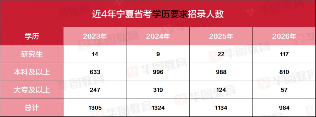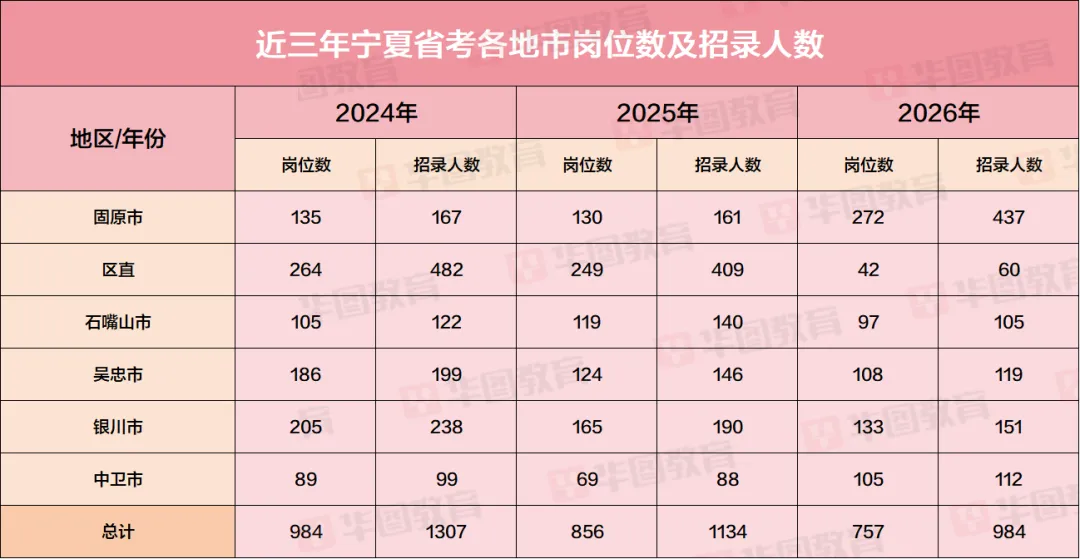2024年招录人数相对较多是区直、吴忠市和银川市。尽管2024年相比大趋势是扩招,但是扩招岗位和人数都不多。2025年大幅缩招,2026年招录人数也更是大幅度下降,岗位也相对减少,可能今年的分数会大幅提高,大家尽可能选择合适的岗位报考 ,热门岗位也要相对斟酌一下。