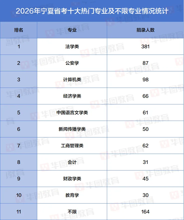 由于公务员的职位性质, 对法学类、 计算机类、 中国语言文学类确实比较青睐, 也就形成了公务员报考的热门专业。此次2026年宁夏公务员招录岗位,法学和计算机类招录人数较多,热门专业选择空间大。不过也可以看到, 省考基本涵盖了全部大类专业, 只是某些岗位可选择职位较少。还有不限专业的岗位,只是有其他要求限制。
