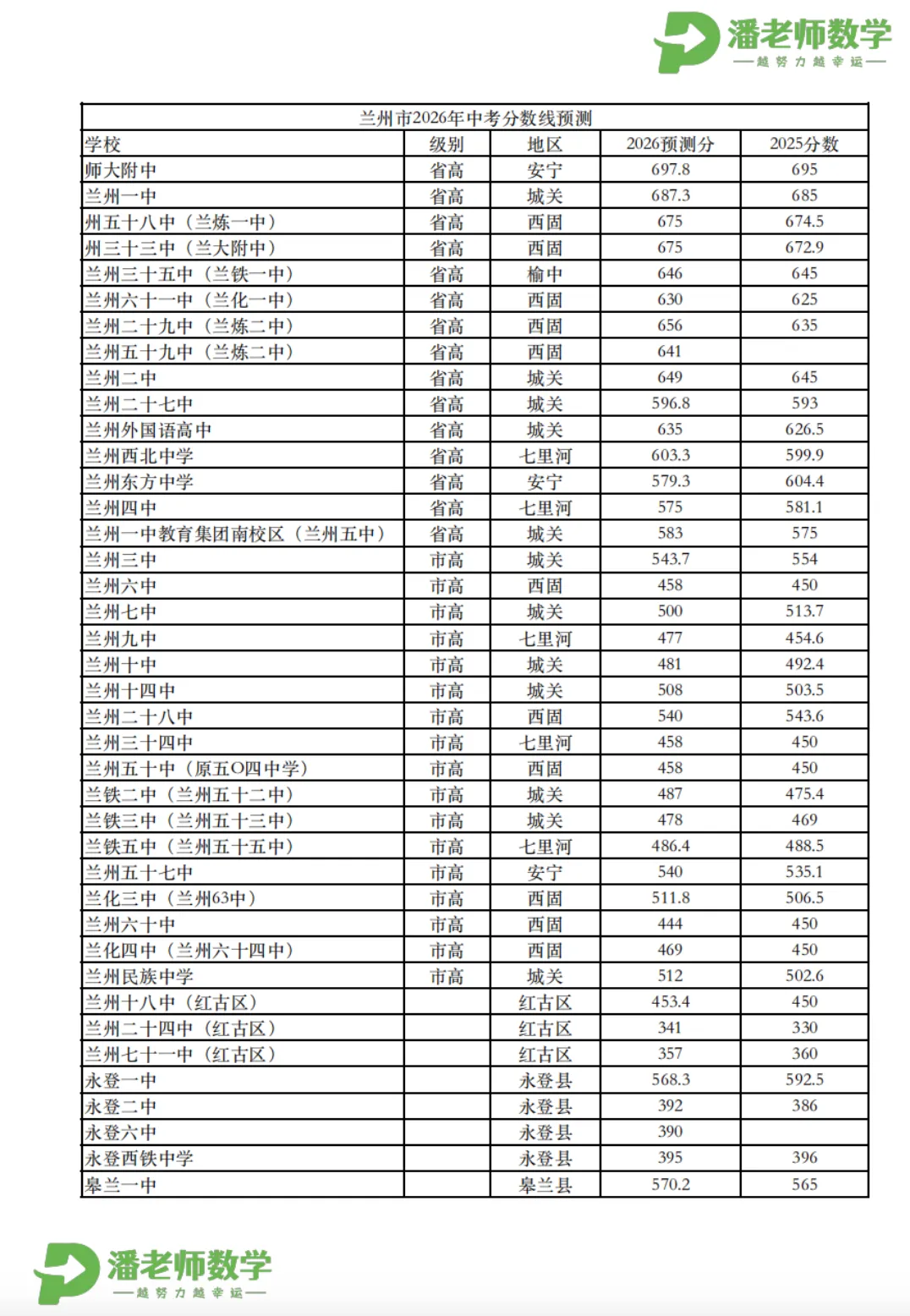 潘老师工作室为大家整理了2026年兰州市中考各校录取分数线预测,快来看看你心仪的学校今年预计多少分能上!