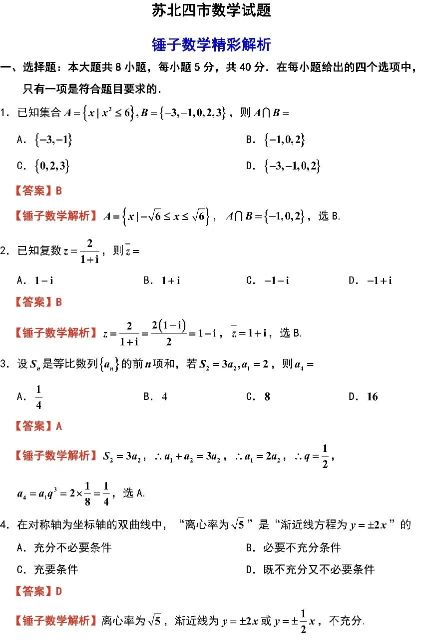 苏北四市一徐州、淮安、宿迁、连云港一模考试数学试卷及解析