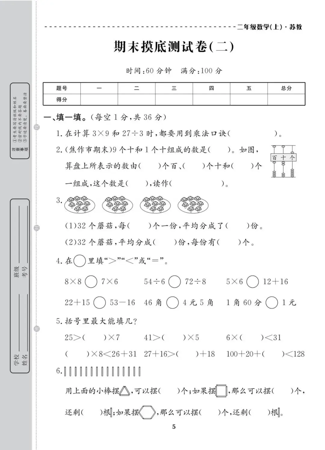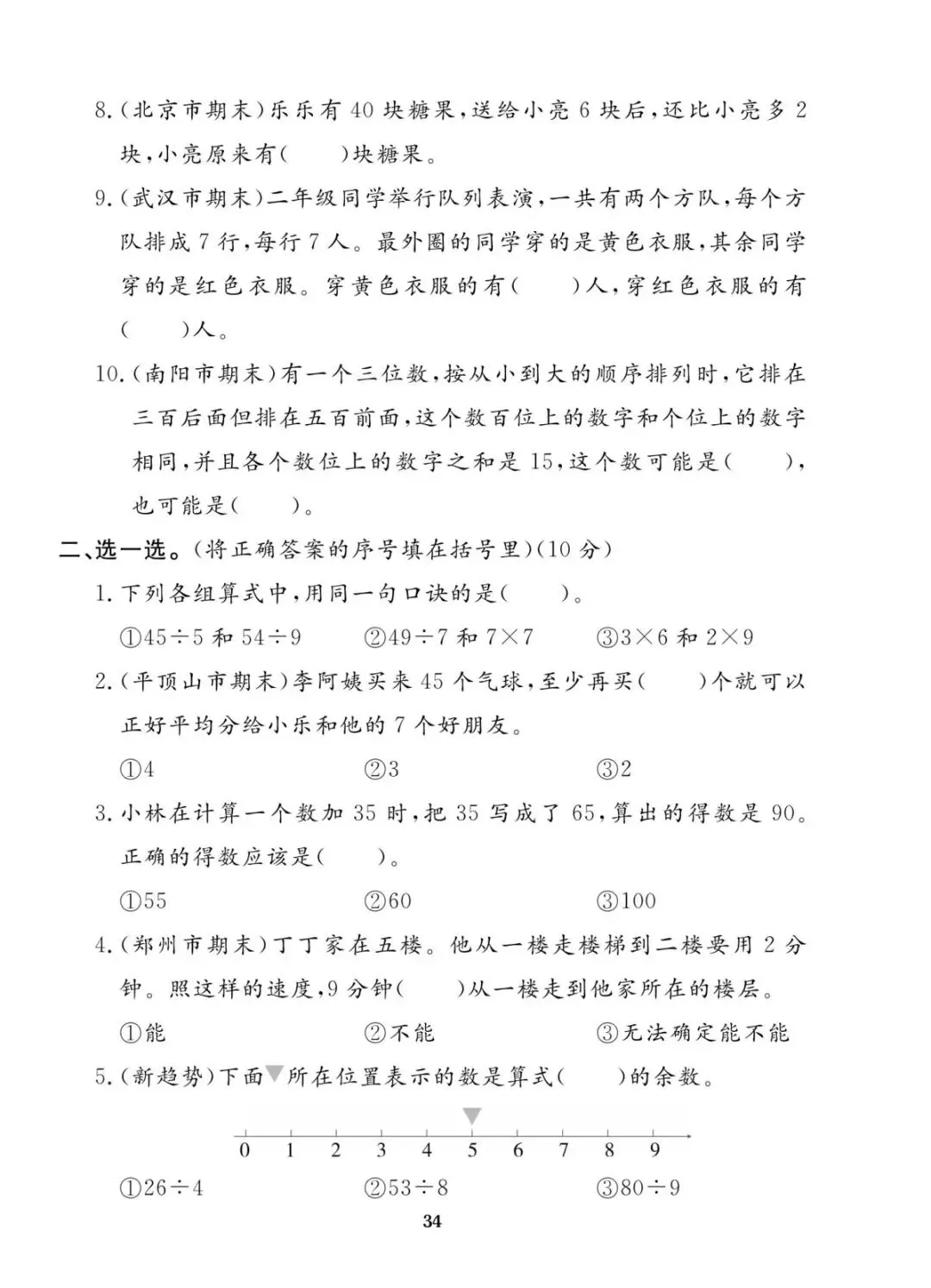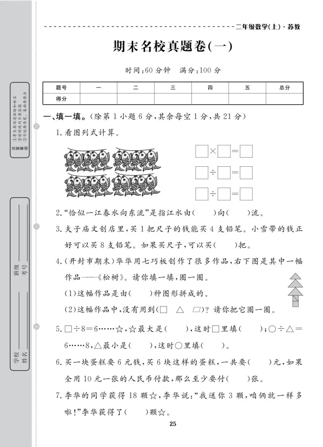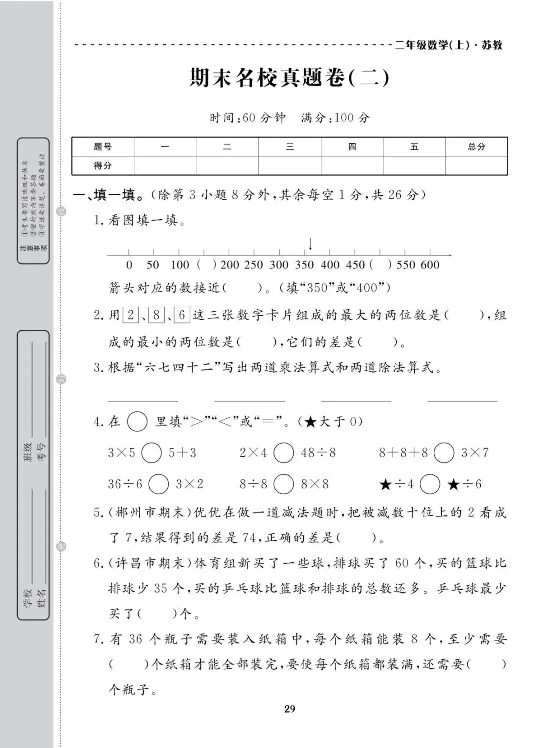 苏教版 二年级上册数学期末真题考试卷10套|含答案 电子版可打印