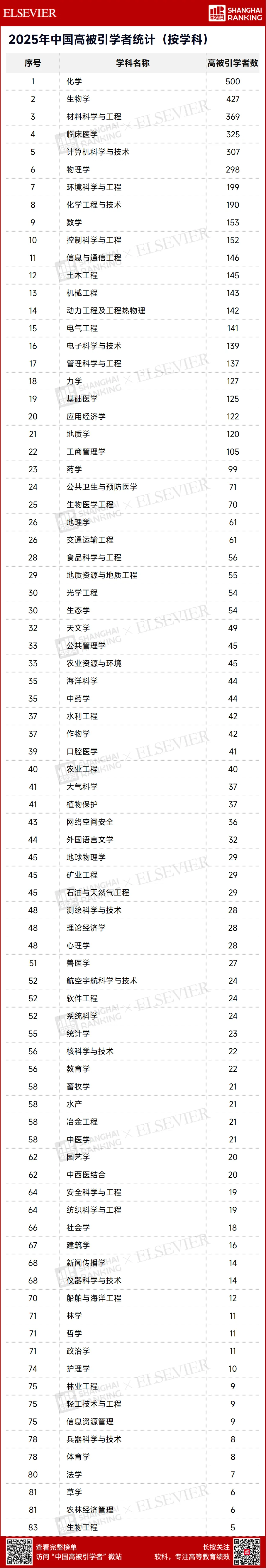 2026年1月30日,爱思唯尔(Elsevier) 正式发布2025“中国高被引学者” (Highly Cited Chinese Researchers) 榜单。此榜单以全球权威的引文与索引数据库Scopus作为中国学者科研成果的统计来源,采用上海软科教育信息咨询有限公司开发的方法,爱思唯尔为该榜单提供了数据支持和技术实现。2025“中国高被引学者”上榜共计6310人,来自543所高校、企业及科研机构,覆盖了教育部10个学科领域、83个一级学科。据统计,2025“中国高被引学者”排名中,中国科学院(其各科研院所合并统计)拥有最多的高被引学者,共513位。