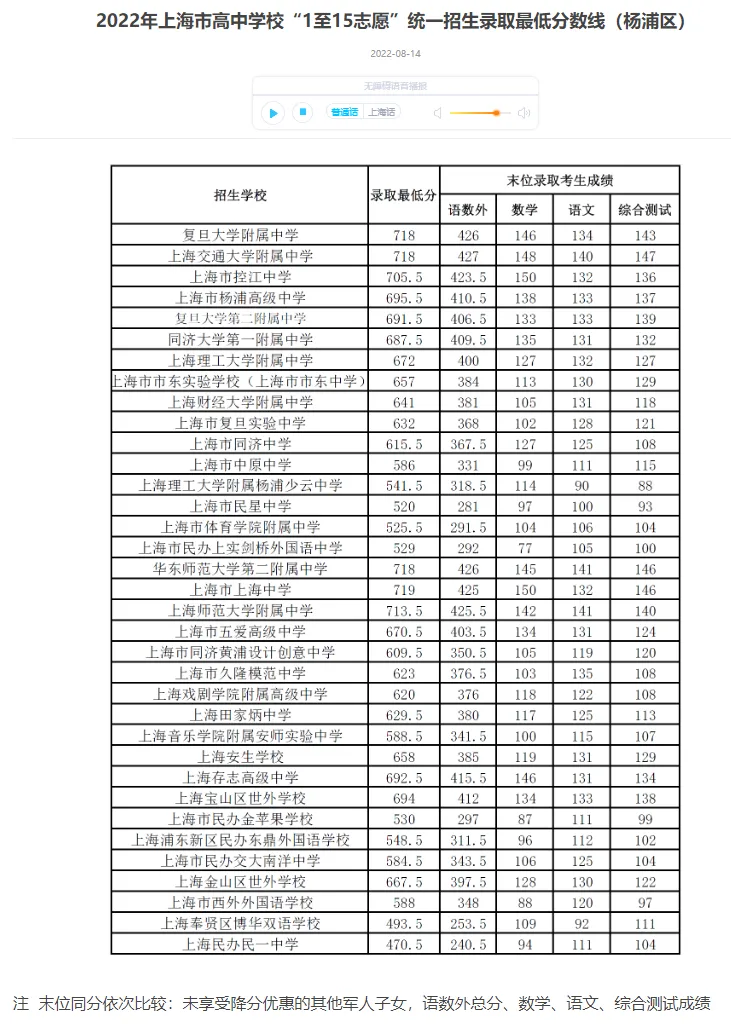 今天(8月14)上午,上海各区公布了统一批次“1至15志愿”招生录取的最低分数线,学生可通过报考区的招考机构网站查询录取结果。