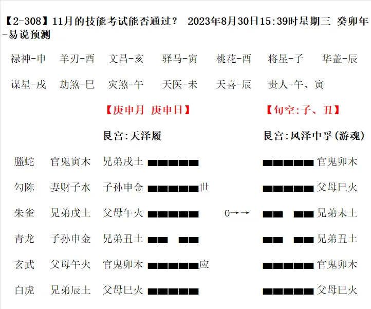 断卦:四爻发动的父母午火就代表11月份的考试,父母发动克世爻,但世爻子孙申金临月临日,特殊旺相,表面上看是不怕克,但这里要注意三个问题:①世爻临月临日,特殊旺相,就要看卦主实力是不是很强,如果很强就对轨,如果实力不是很强,那就有太过的嫌疑。②特殊旺相也有时间限制的,起卦时是8月,11月才考试,这个特殊旺相就已经消退了,顶不住父母来克了。③这卦是特指之占,父母午火变兄弟未土是化绊,有真绊的嫌疑,也是不好的预兆。