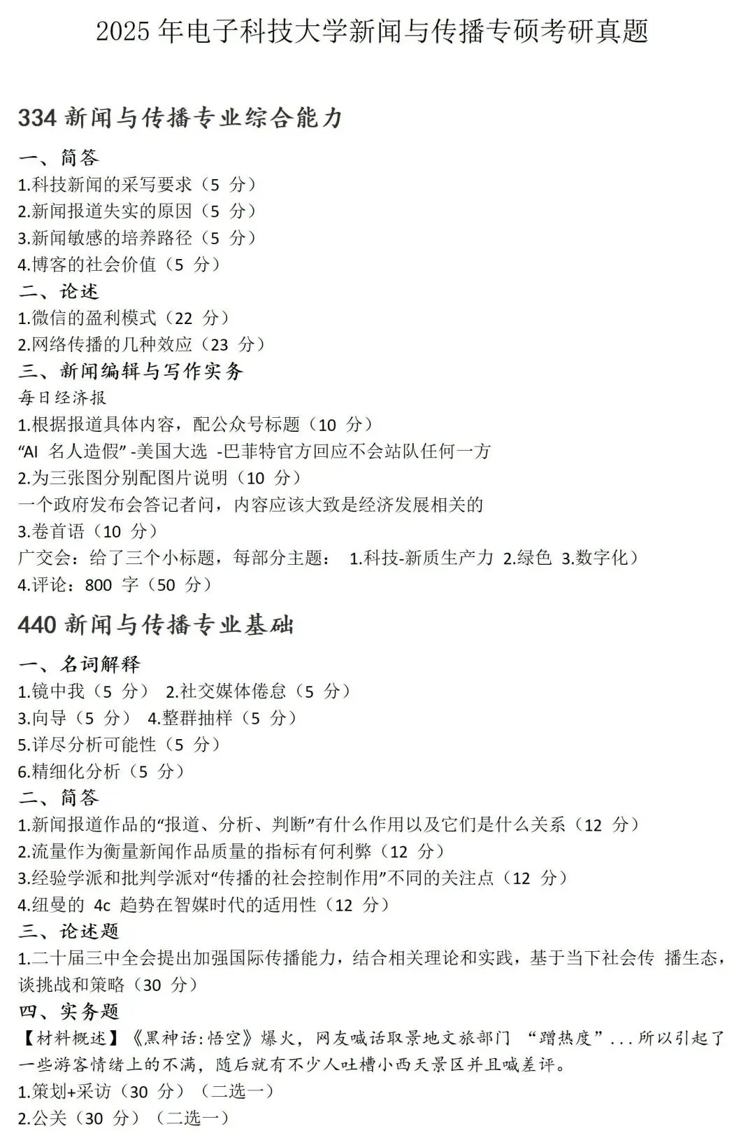 电子科技大学新闻与传播考研真题2019-2025历年