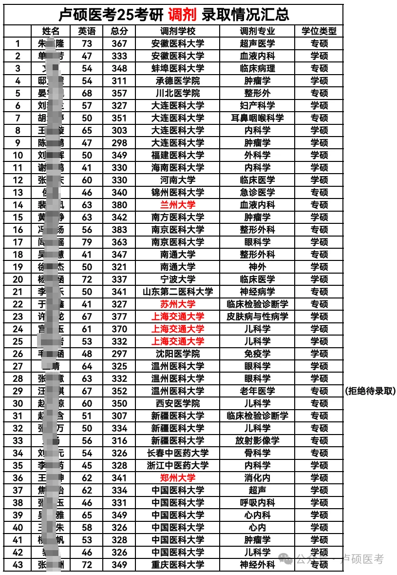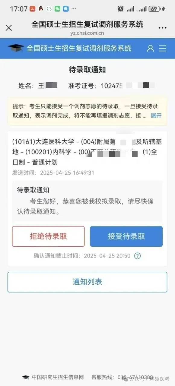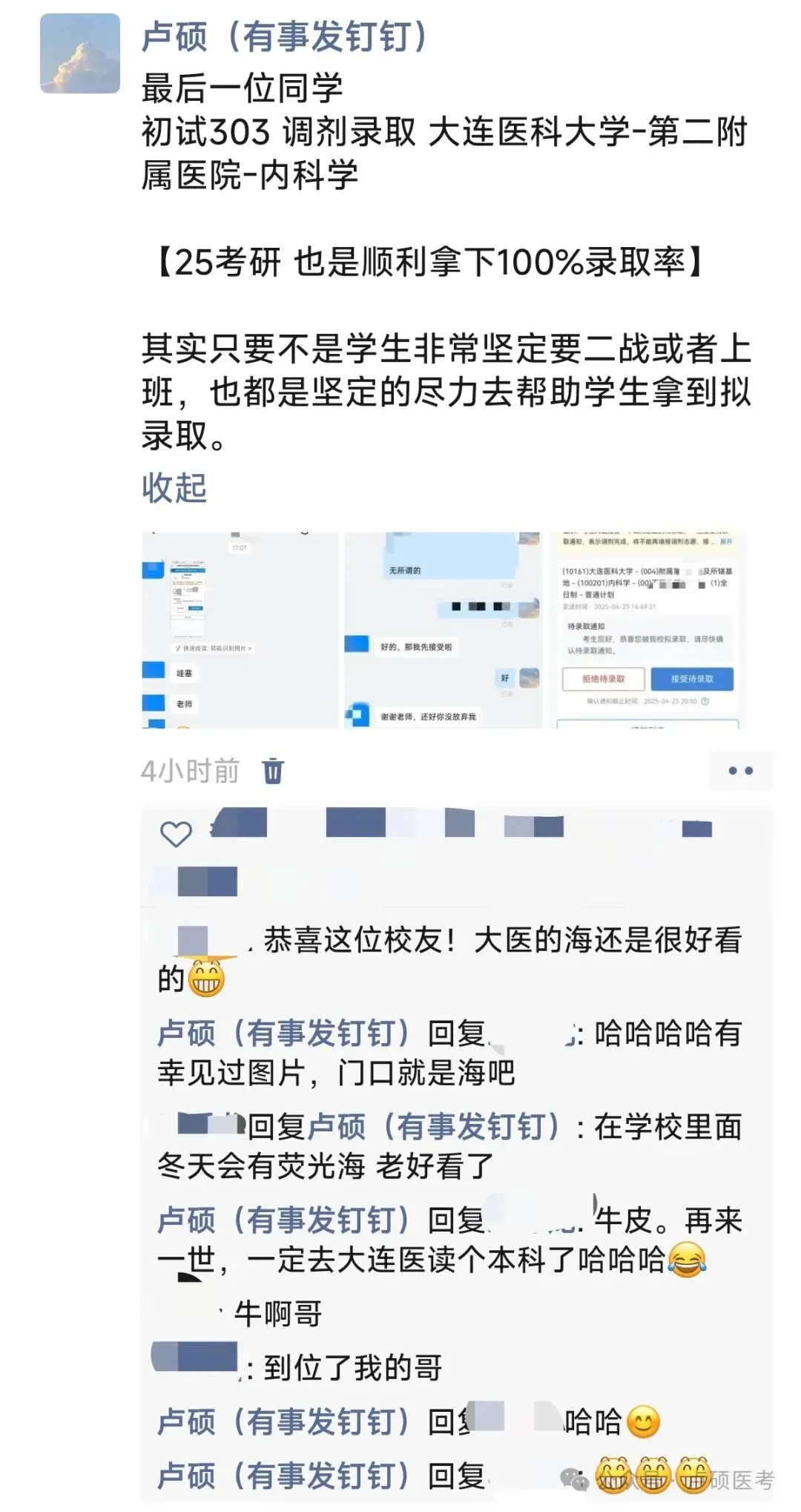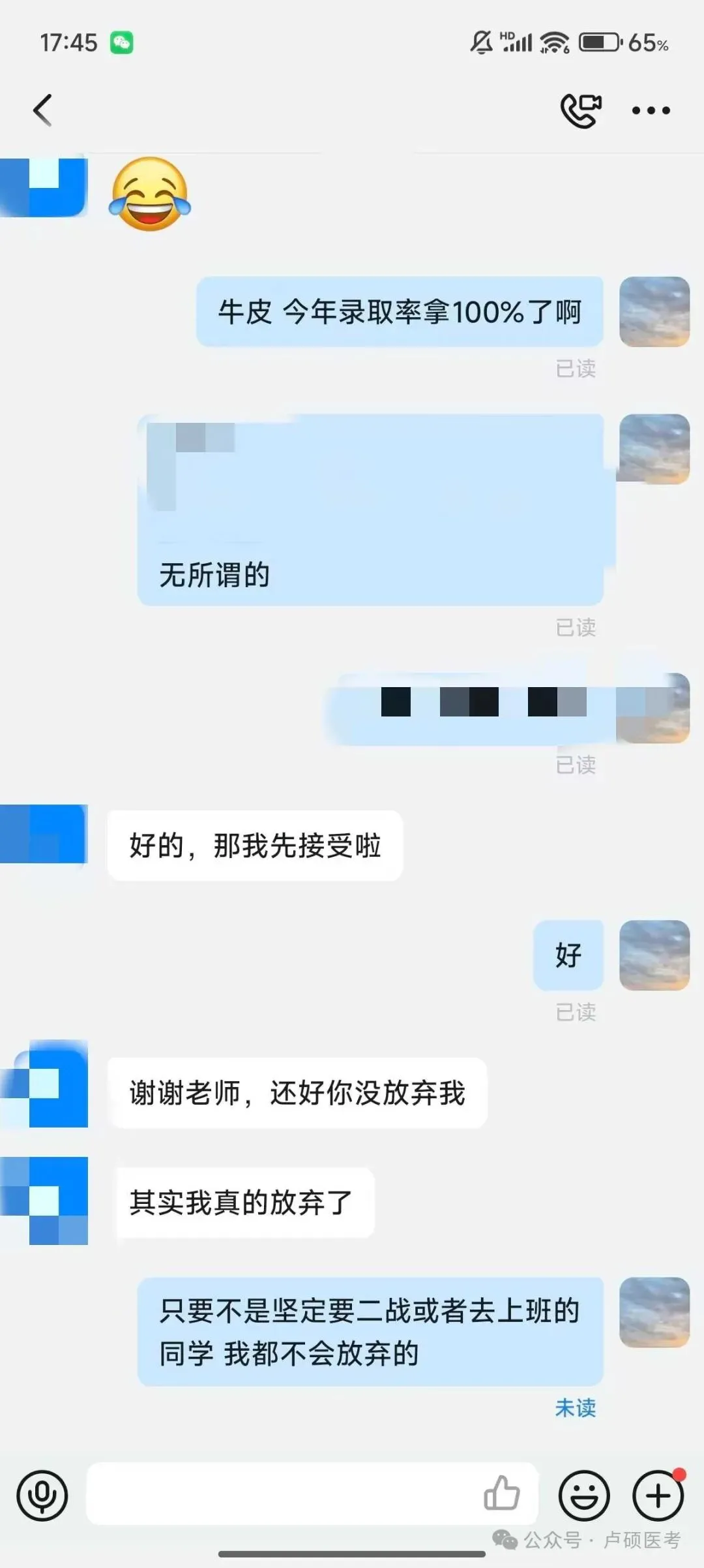 录取人数确实和大机构比不了,但录取率还是可以跟比大机构有比一比的除去主动放弃调剂的考生,或学生自己填调剂系统或我来填调剂系统,但凡还是有想上学 的想法,最终每位同学均录取。以上所有数据均为卢硕医考25考研真实录取情况,均可负法律责任。我是真的开心到爆啊兄弟们,顺利拿下100%录取率!!!真有机会重生的话,我肯定要去大连医读个本科哈哈哈哈。同学自述自己放弃了,最后这几天,研招网也确实这几天我在帮忙填的其实只要同学们不是很坚定的要去二战或者上班,我觉得首先确保拿到一个拟录取,具体去不去再说嘛初试303 调剂录取 大连医科大学-第二医院-内科学我的复试班,除了我确实没法替你上考场,其他的能尽力去帮你是会去帮你的肯定还是要充分准备一下复试,因为不可能一问三不知,还能拿到拟录取通知的前面复试班报名阶段,很多同学咨询时候问是不是包过的还有些甚至有的说动用“魔法力量”能找到导师走后门,这种据说得20万我们不去猜想这些到底是不是赌概率,是不是能真正帮你走后门的单从结果来看,我觉得 几千块的东西给到了几万块的东西的结果性价比是拉爆了,我最爱的小米手机,也是性价比拉满的。单纯做培训角度来讲的话,聊其他的没有意义,把录取率做上来,惠及到每一位学员,踏踏实实走好脚下的路,才是发展的根本。