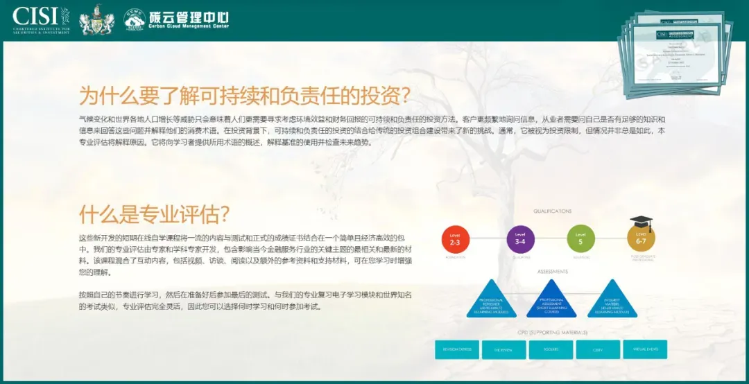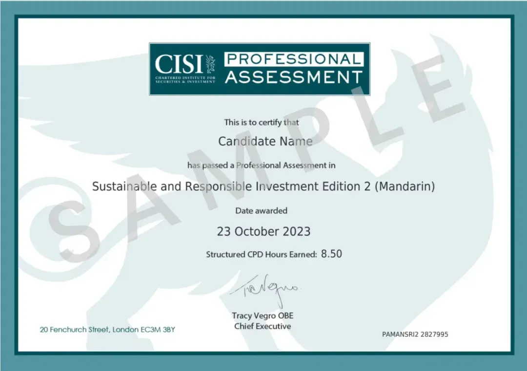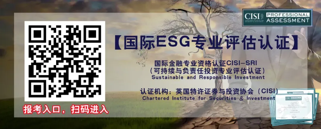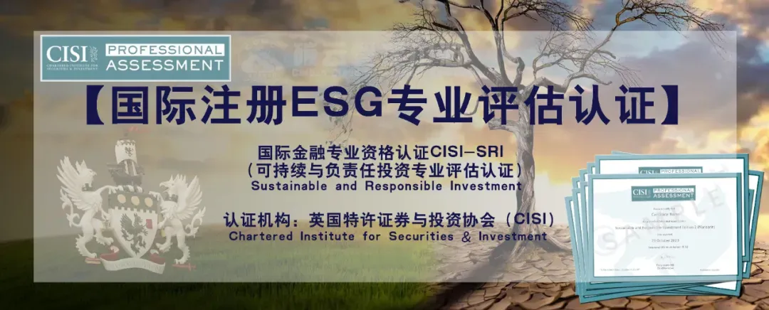 国际注册ESG专业评估认证,是由英国特许证券与投资协会 Chartered Institute for Securities & Investment 颁发的的国际权威ESG专业人才评估认证,业内称之为可持续与负责任投资专业评估认证。