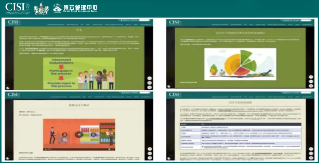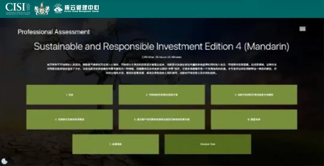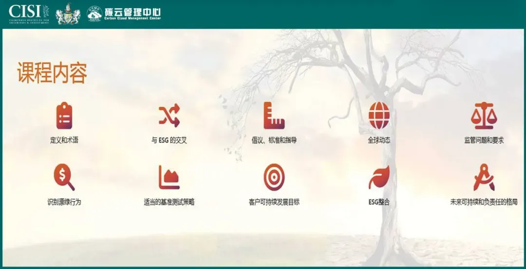 官方课程内容包含:定义和术语,ESG 交叉研究,目标、标准和指导,全球发展,监管问题和要求,识别漂绿,适当的基准战略,客户可持续发展目标,ESG 集成策略,未来可持续和负责人投资的愿景等。