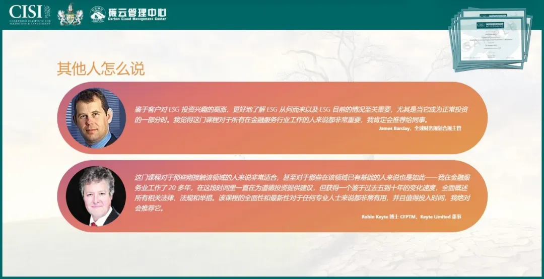 知识体系前沿:国际前沿ESG知识+国内ESG实践教学;权威专家行业引领;国际ESG证书权威认证、获得欧洲乃至全球金融机构广泛认可。