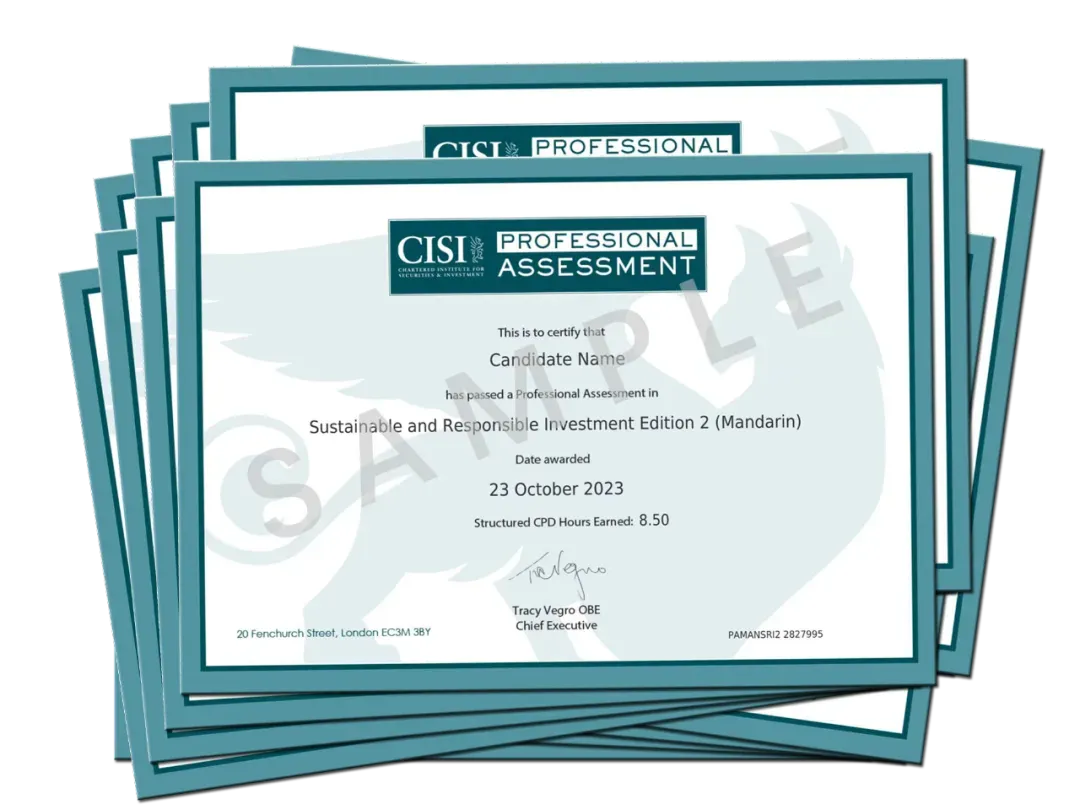 完成本课程并通过考试后,您将获得一份由 Chartered Institute for Securities & Investment 签发的国际注册ESG认证,证书获得包括英国、卢森堡、迪拜在内的欧洲及全球国际金融中心监管机构的认可,助您提升专业等级,增强能力及客户信任。