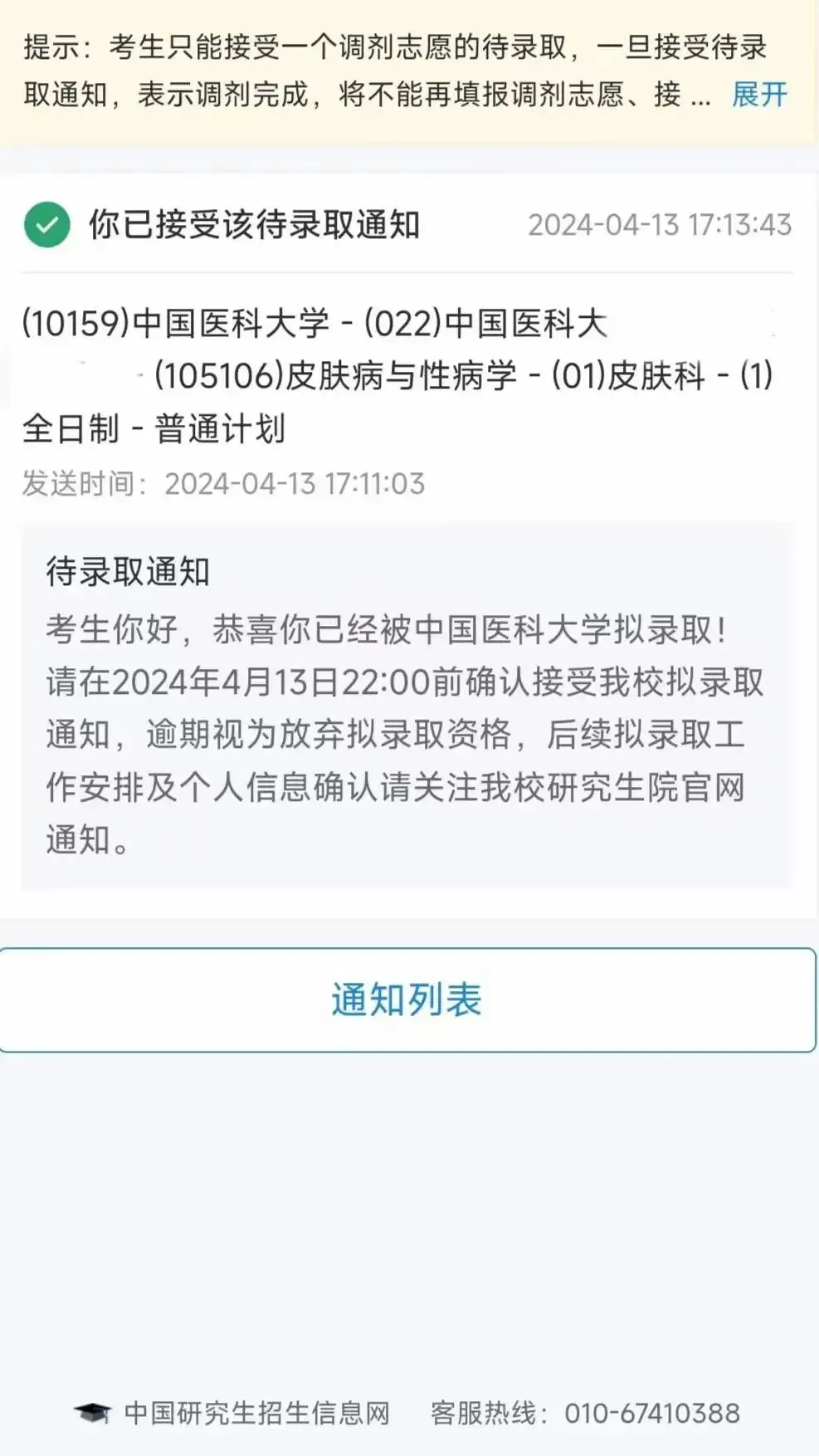 初试380+ 调剂录取 中国医科大学皮肤病与性病学专硕