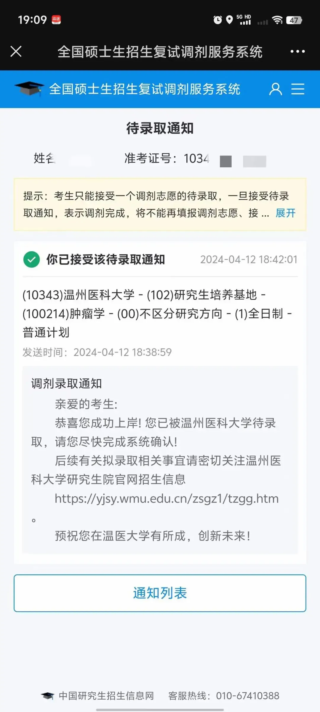 初试340+ 调剂录取 温州医科大学肿瘤学