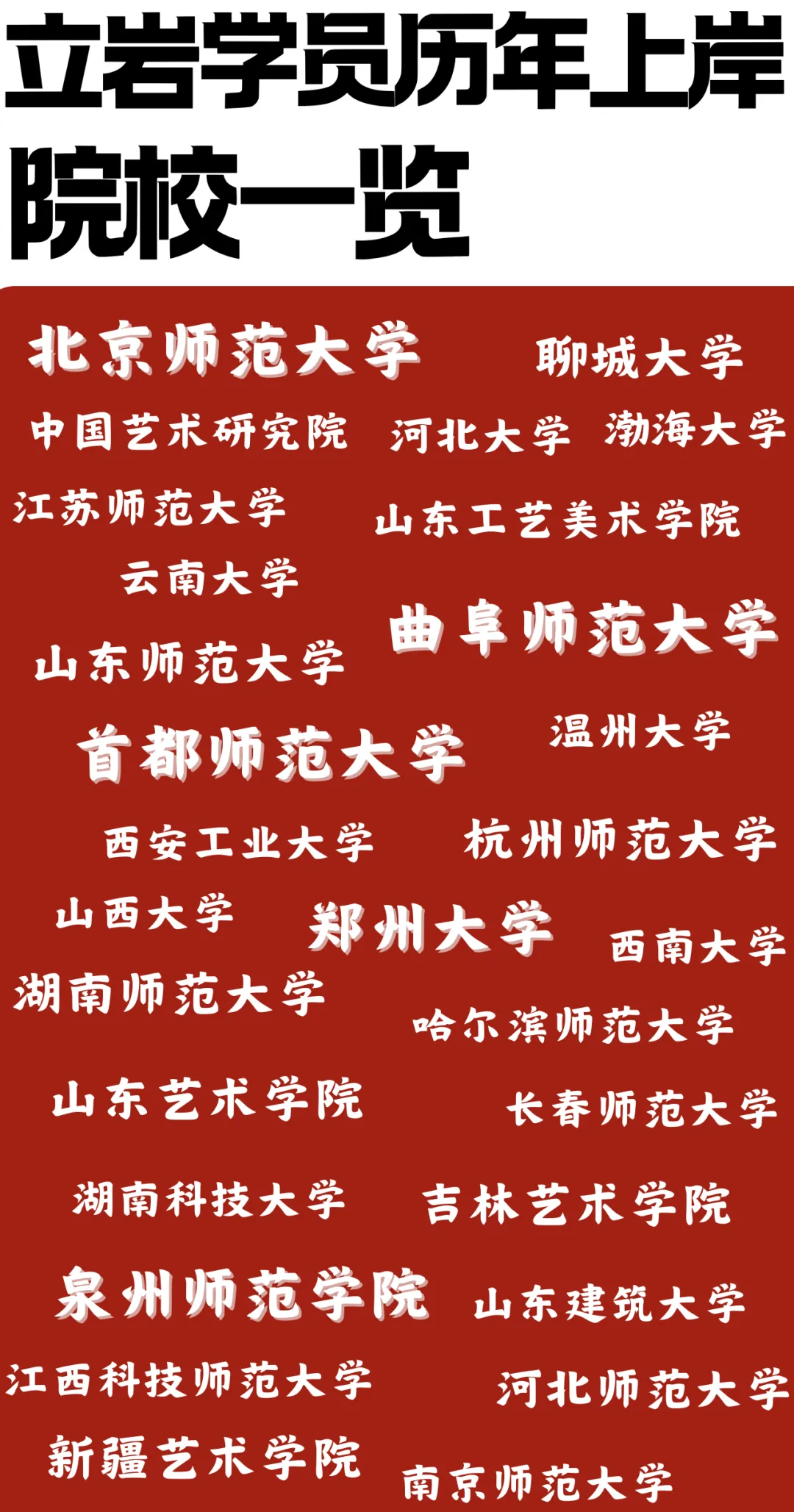 七年来,我们的教学已取得优异的成绩,数百名学员被录取到北京师范大学、首都师范大学、郑州大学、曲阜师范大学、泉州师范学院、西安美术学院、山东艺术学院、华东师范大学、西南大学等全国数十所高校。