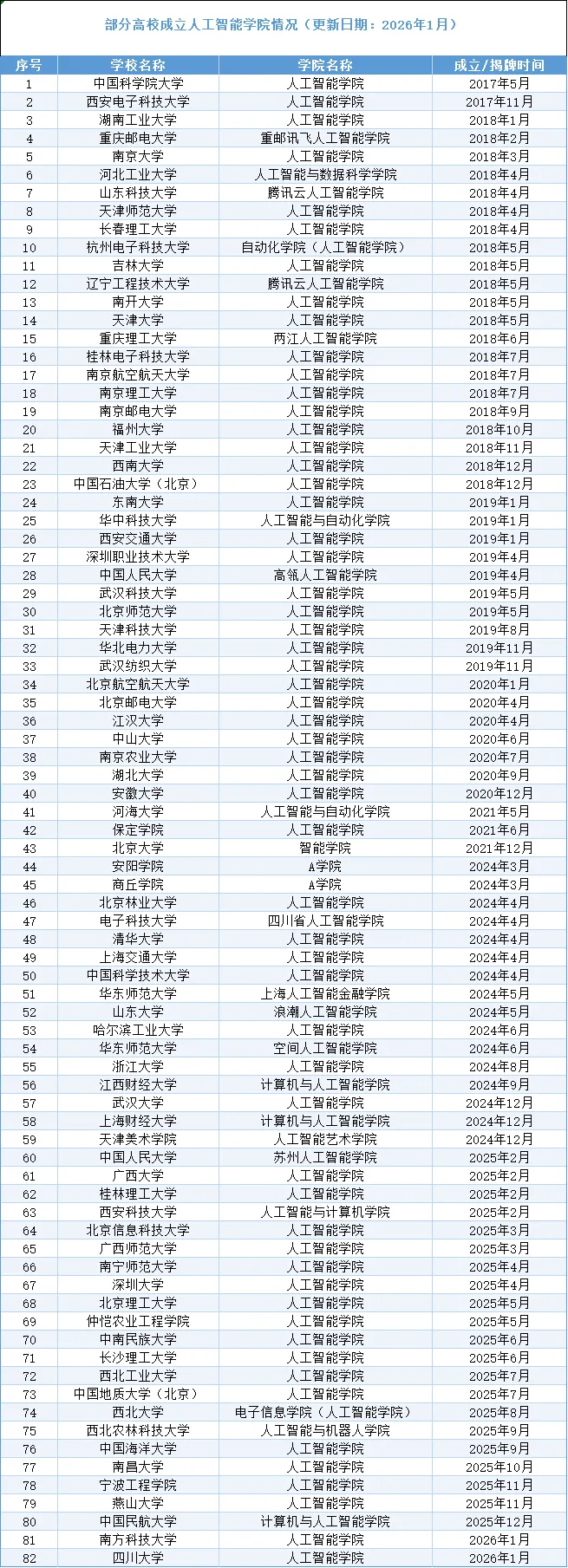 2026年1月17日,南方科技大学人工智能学院正式揭牌成立,这是2026年国内成立的第一所高校人工智能学院,标志着我国高校人工智能学院布局持续深化扩容。