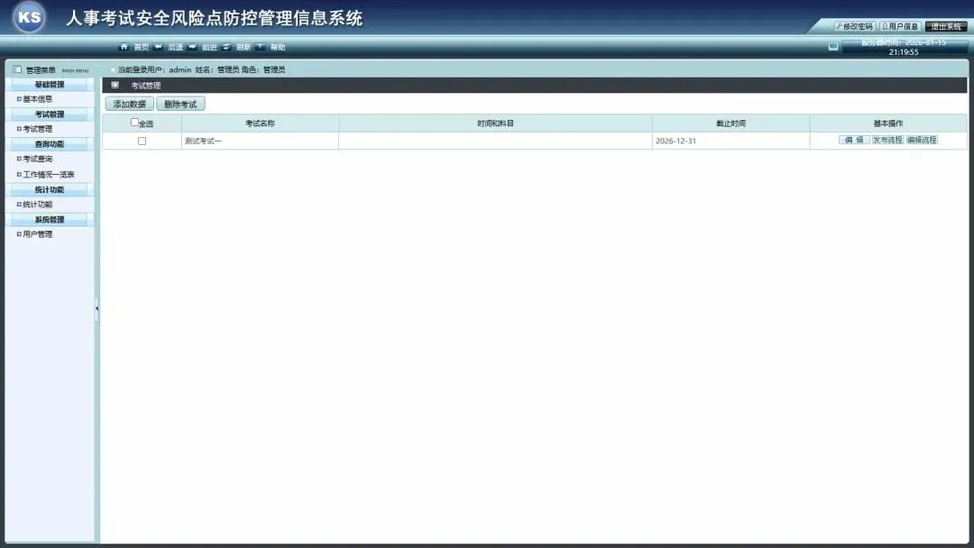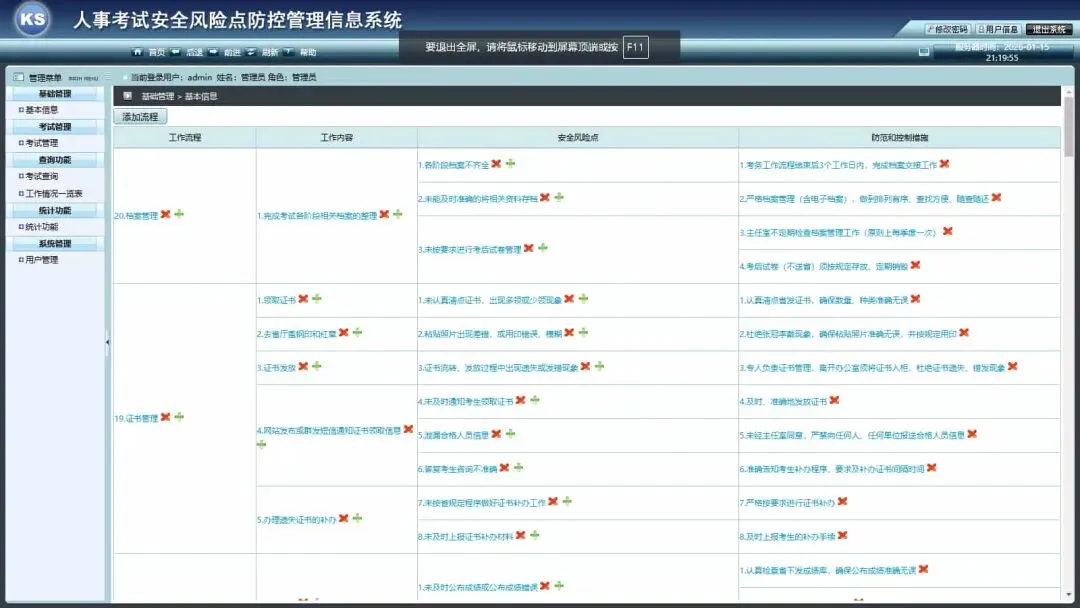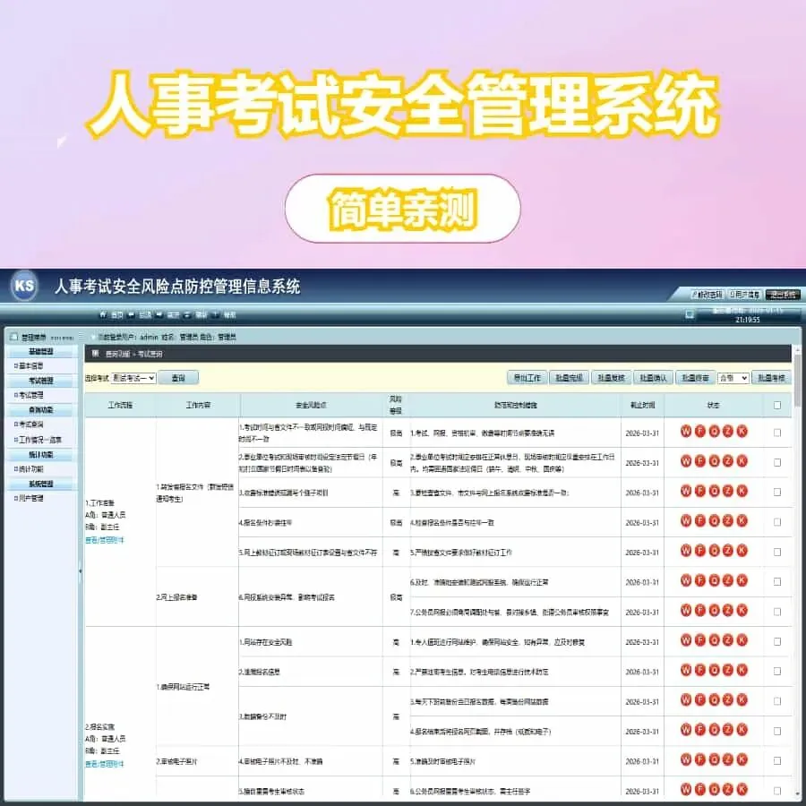 发布考试全流程信息,包括:工作流程、工作内容、安全风险点及相应的防范与控制措施。