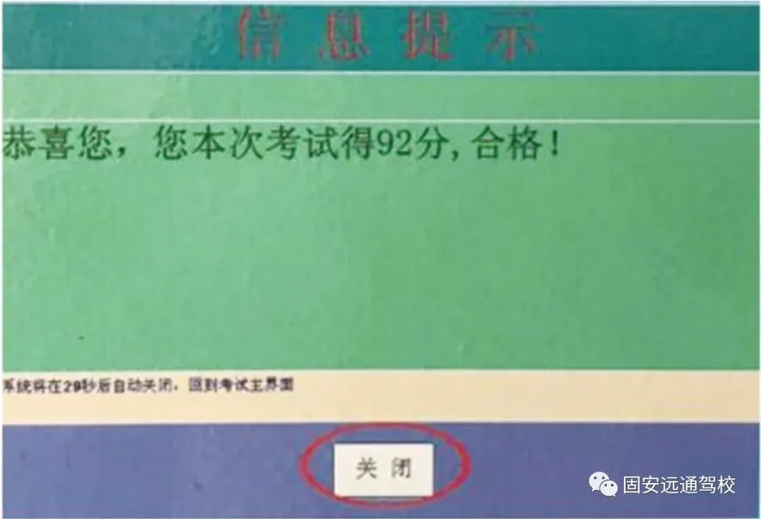八、点击【确认交卷】之后电脑屏幕出现上图,考生确认自己考试分数点击【关闭】,然后起身离开考场,考试结束。