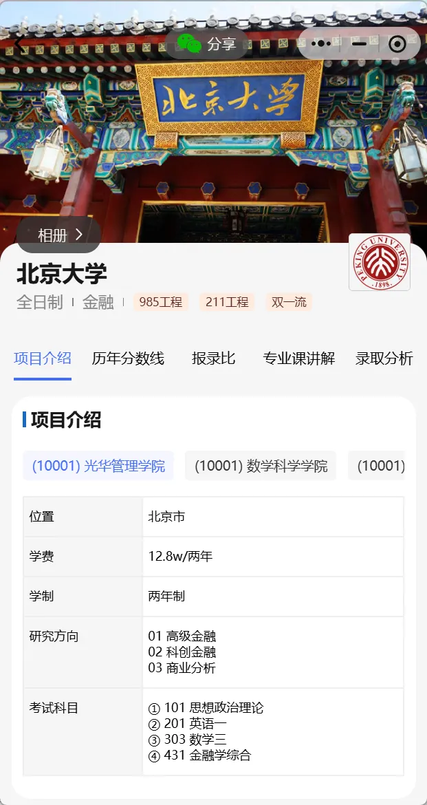 核心数据:点进【光华管理学院】的金融专硕,详细信息直接列明:地处北京,学费12.8万/两年,学制两年,考试科目是政治、英语一、数学三和金融学综合。