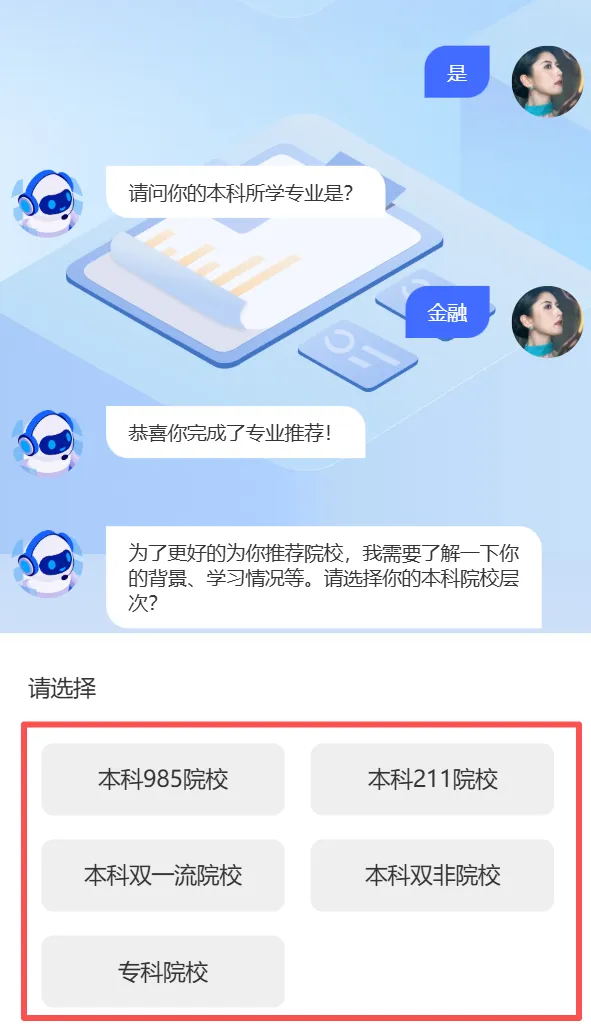 AI择校:就像一位资深咨询师,你只需要根据提示选择你的基本情况、意向地区和偏好,它会基于庞大的院校数据库和录取规律,为你生成一份个性化的推荐院校清单,科学缩小选择范围。