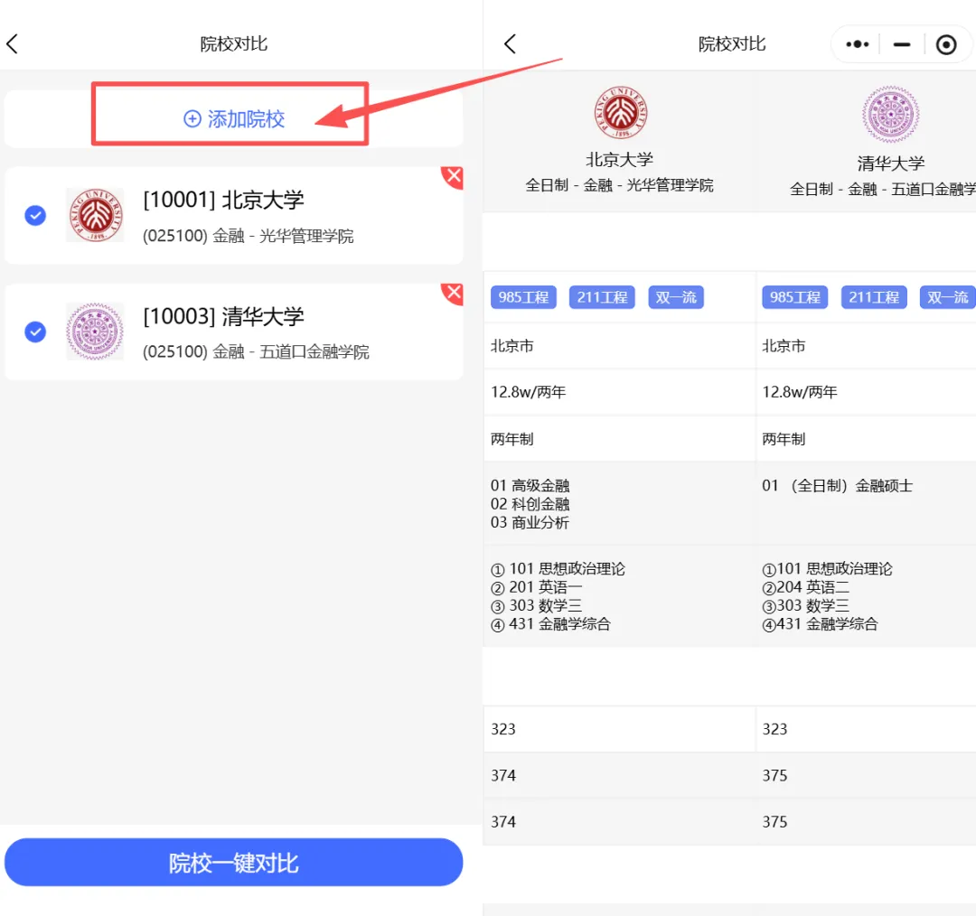 院校对比:选择困难症的终极解药,可以将北大、清华等多所意向院校同屏对比。从院校层次、地理位置、专业排名、学费、报录比到考试科目,差异一目了然。从此,择校不再是拍脑袋,而是基于数据的理性决策。