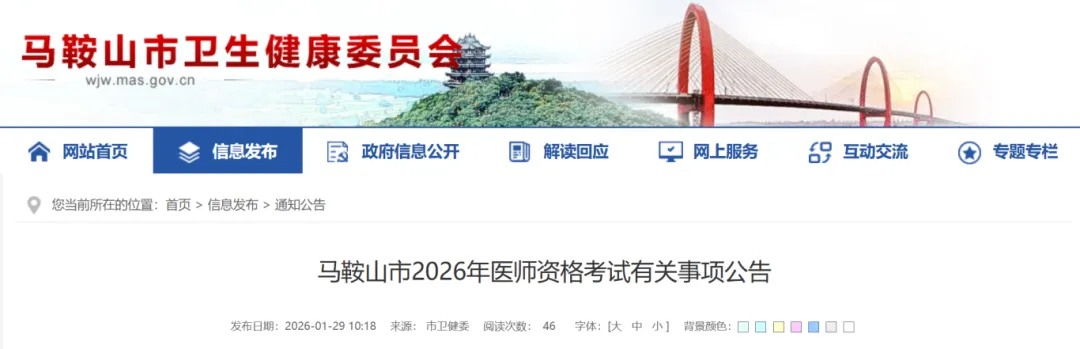 根据国家、省卫生健康委工作要求,我省将正式启用国家医学考试报名线上审核辅助子系统。临床、口腔、公共卫生类别和乡村全科执业助理医师医学人文部分启用修订后的考试大纲。为确保2026年医师资格考试马鞍山考点报名和现场审核相关工作平稳、有序进行,现就有关事项公告如下: