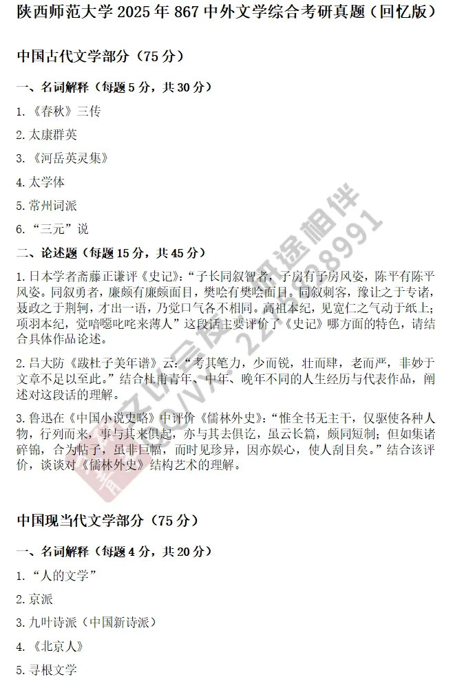 需要注意的是,近年767和867的题型设置时有变动,主要在于填空题的出现,如2023年填空题出现在867的中国古代文学部分,2024年则出现在767中。而填空题的考查需要对学科知识点的细小处有特别关注,这一考查形式的不稳定性再次体现出陕师大对考生基础知识全面掌握的能力要求。