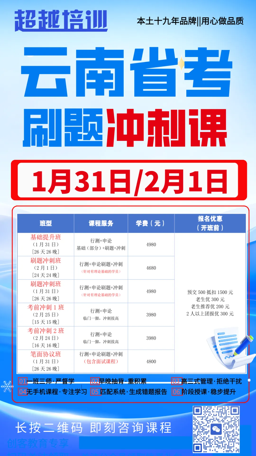 红河超越培训,自2007年建校以来,专注云南公考辅导18年,一直扎根红河,潜心专研,对云南公考考情了解透彻,研发紧扣云南公职考试大纲,根据不同的地市,不同的考情进行针对性的研发和教学,为考生提供更专业的考试方法和技巧培训。