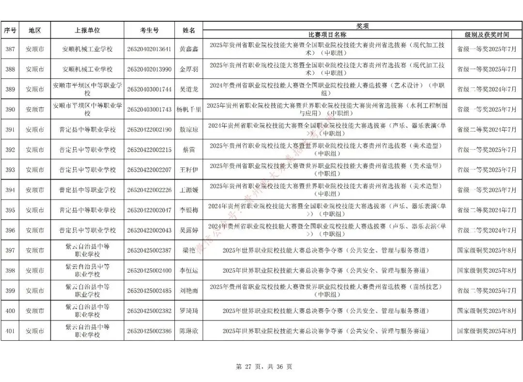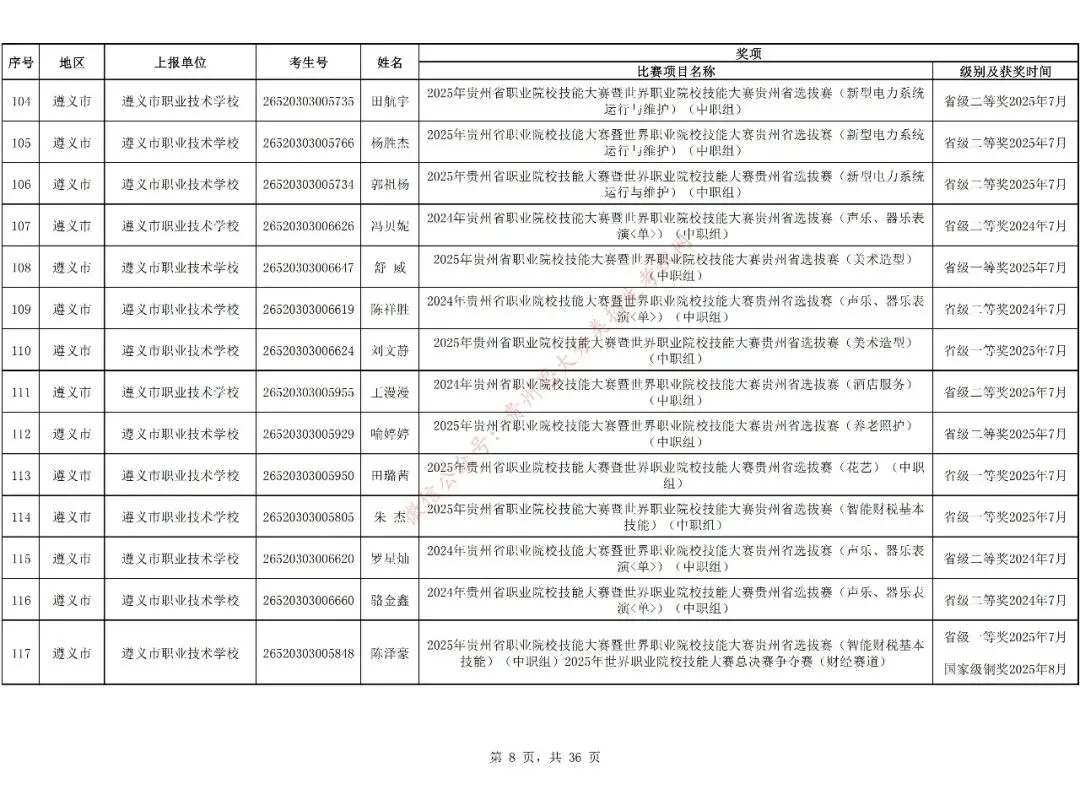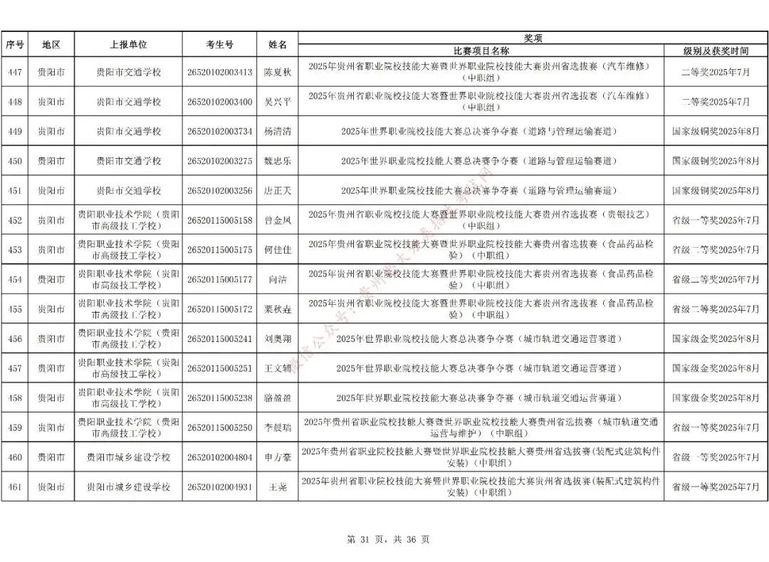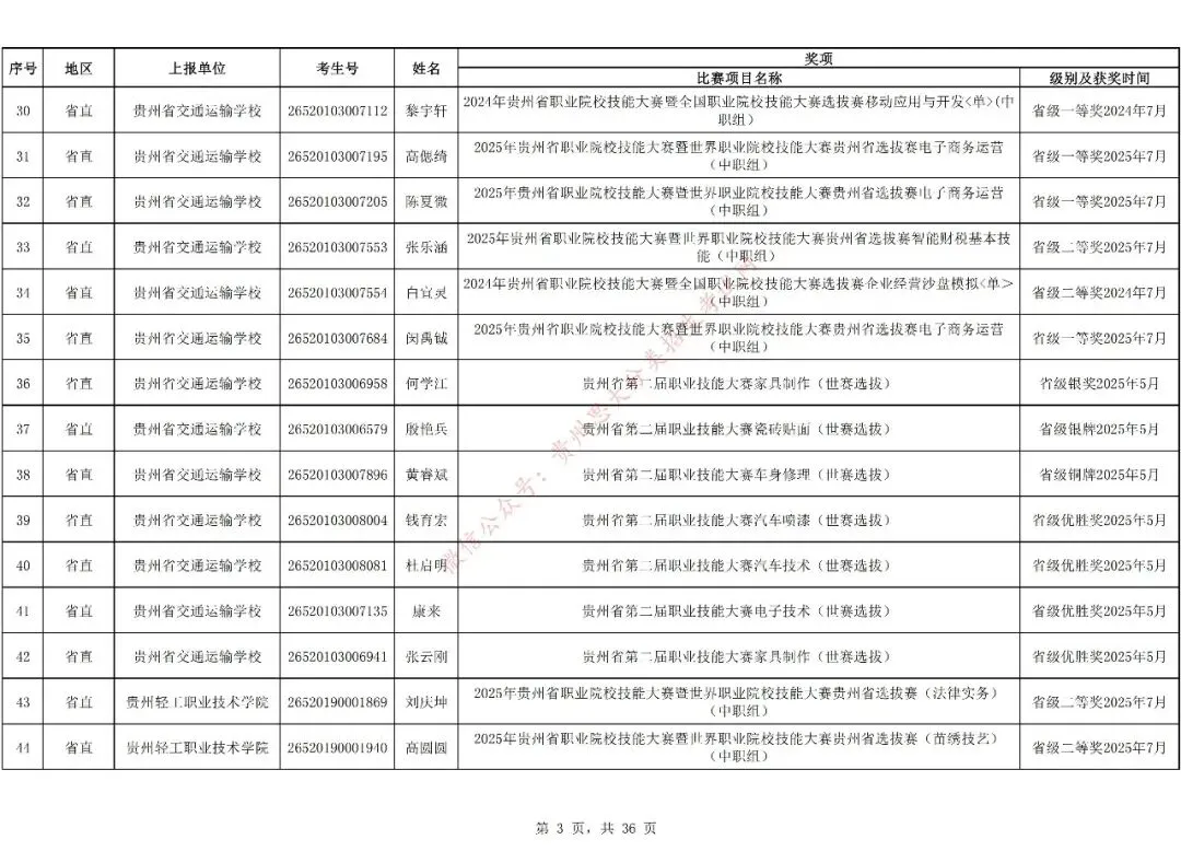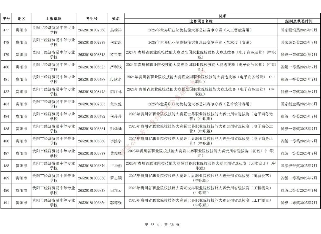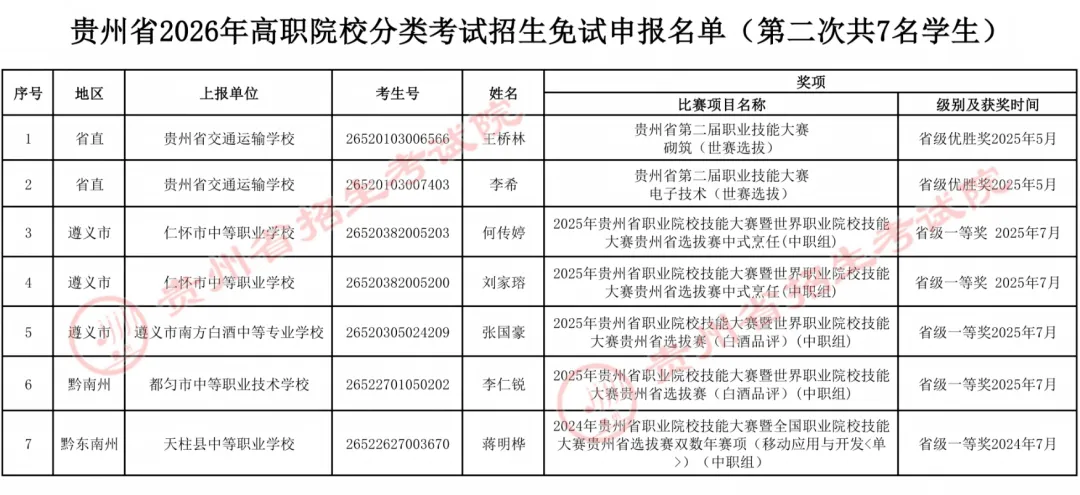 1.对在校期间获教育部牵头举办的全国职业院校技能大赛三等奖及以上、教育厅牵头举办的贵州职业院校技能大赛二等奖及以上的中职生可免试进入高职(专科)院校学习,但专业须相同或相近。