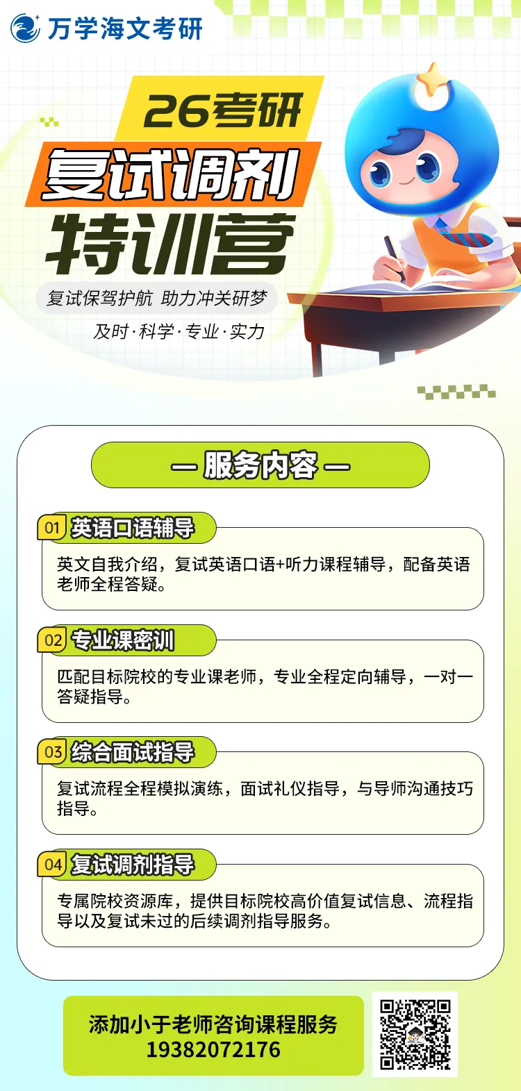 当然,只要有一丝上岸的机会都不要放弃!海文考研复试调剂课程,助你把上岸的机会放大!!包含目标院校高价值复试信息、复试面试礼仪、应试技巧、英语口语指导、以及复试现场模拟指导、复试调剂班主任全程跟踪指导等诸多服务,全力助力你的复试调剂之路。