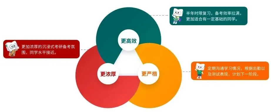从备考、初试到复试,分为导学、基础、强化、冲刺阶段,摸底测试、全程督学、阶段测评、全真模拟、心理关怀,让每一位同学都能体验考研过程中,全程有规划,课程有针对,服务有体系,能够无忧备考的安心感。