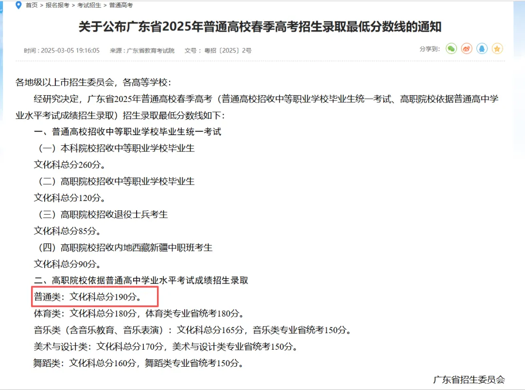 省控线,是由广东省教育考试院统一划定的最低录取控制分数线,是考生拥有投档资格的硬性门槛。只有分数达到对应省控线,考生的档案才会被投放至院校,低于这条线,基本无法参与常规批次录取。参考往年数据,广东春考普通类专科省控线常年保持在150-190分区间,最终分数线以考试院下周二官方公布为准。