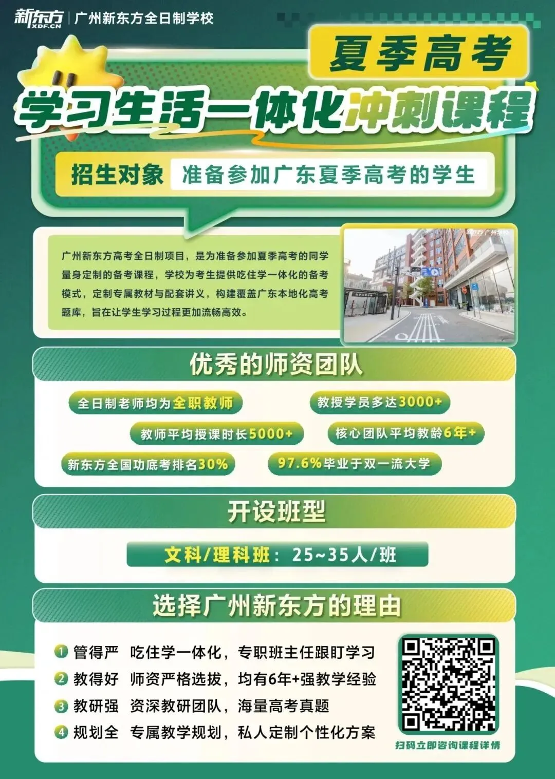 如果之后打算继续备战夏季高考,给自己第二次机会、想实现分数逆袭的学生。看这里!广州新东方高考全日制学校,为每一位学员建立个性化学习档案、定期开展阶段检测、评估学习指导,让每一位学生找到适合自己的学习方法和学科知识体系,陪每一位同学全力以赴,圆梦心仪院校!如果感兴趣不妨扫描下方二维码,到校预约咨询~