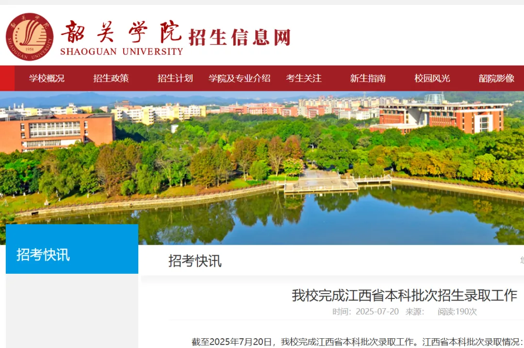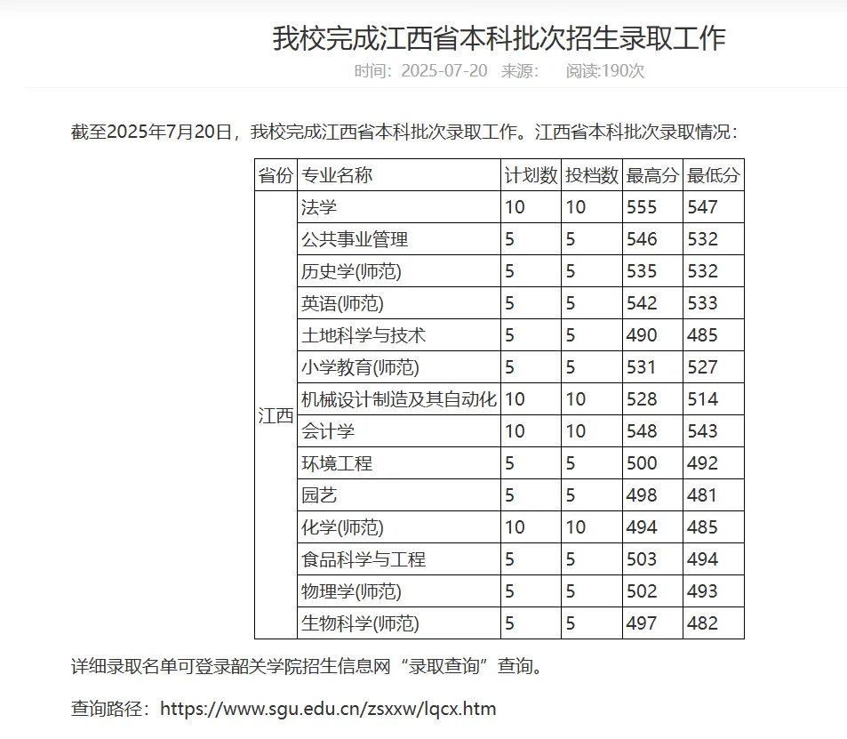 >最高分555分!韶关学院2025年江西高考本科各专业录取分数线!
