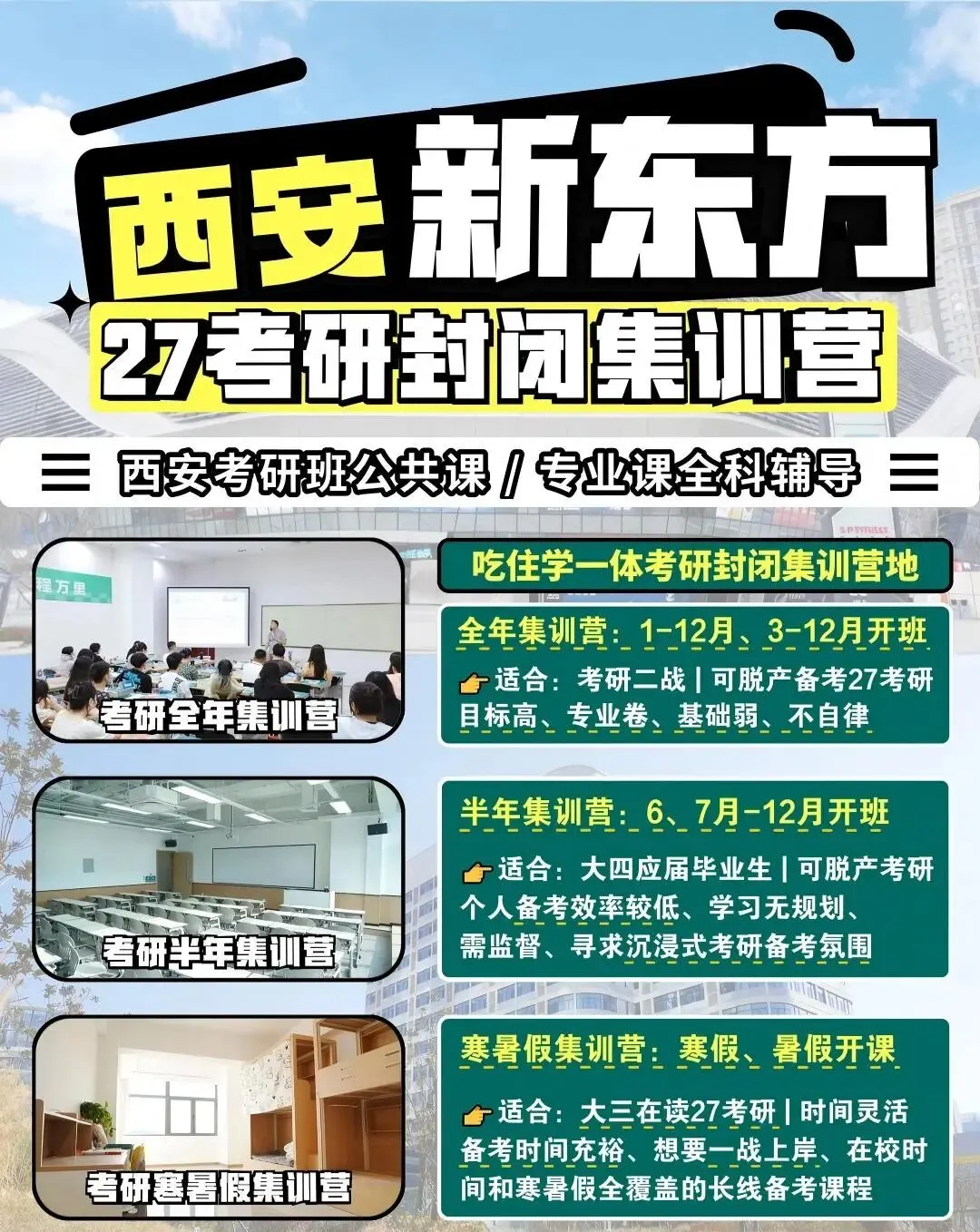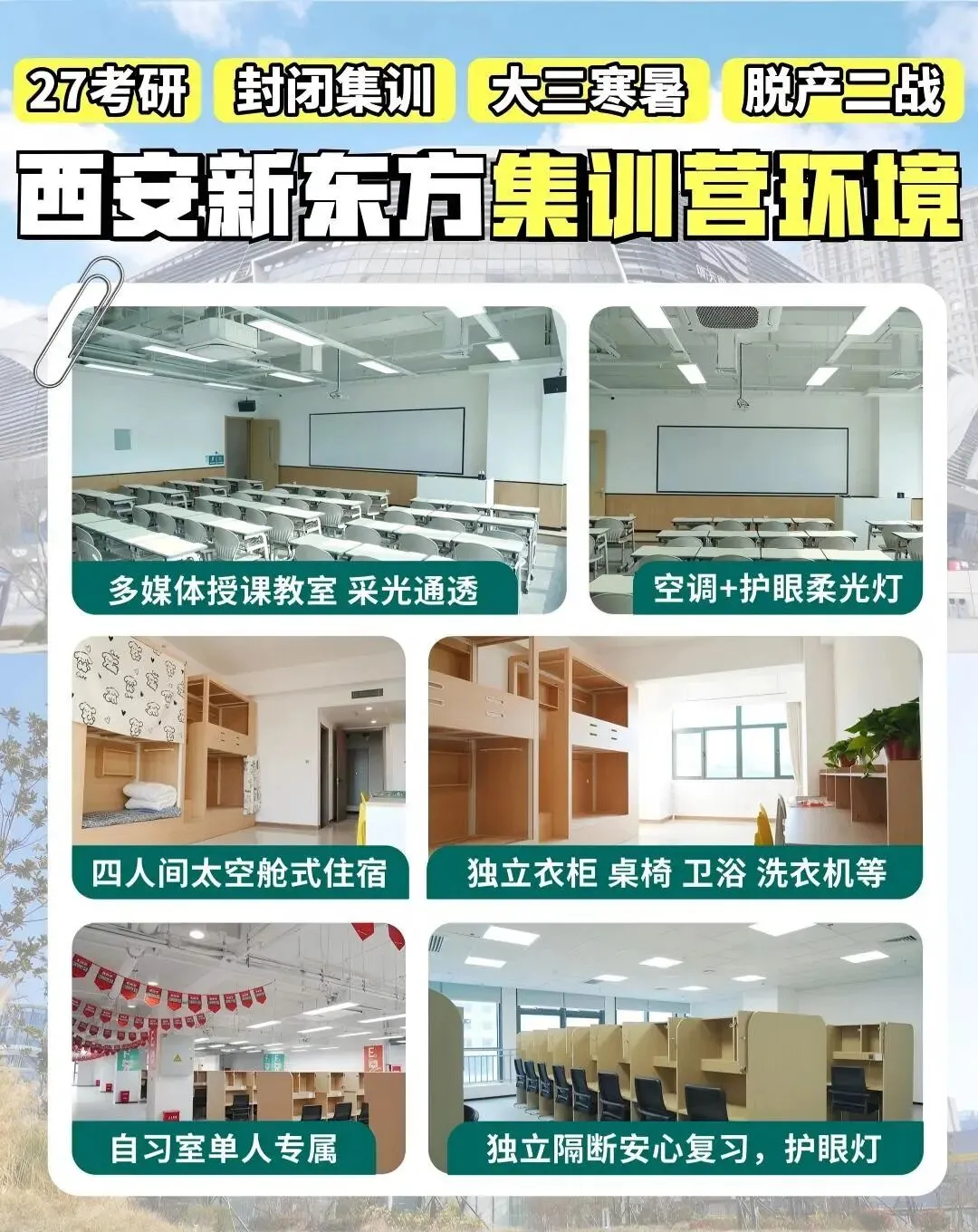 环境是第三位老师。西安新东方考研全年集训营深谙此道,其精心打造的物理与人文环境,本身就是强大的生产力工具。✅专属独立营地,实现真正的沉浸式备考集训营课程并非在普通走读校区进行,而是设有专门的封闭集训营地。例如,位于未央区凤城二路的文景天下集训营校区,内部提供住宿、食堂、教室与自习室,构成一个功能完备的备考微城。这里实行严格的作息管理和电子设备管控,物理上隔绝了社交、娱乐等一切外界干扰,让你能够心无旁骛,将全部能量聚焦于学习本身。✅酒店标准生活配套,保障无忧备考与艰苦的刻板印象不同,新东方集训营致力于提供舒适的备考体验。营地住宿参考酒店标准,房间内配备空调、独立卫浴等设施,确保学员能得到良好的休息。校区周边生活配套成熟,餐饮、购物便利。专业的教务与生活老师提供后勤支持,从早叫醒、晚查寝到生活疑难解答,确保学员无需为琐事分心。✅浓厚的同辈氛围与精细化管理在营地内,你会被同样志存高远、全力拼搏的同学所包围。这种积极的同辈压力与并肩作战的归属感,是独自备考无法获得的强大动力。同时,精细化的管理渗透到每个细节:从清晨的晨读、定期的全真模考,到学管师的个性化督学与反馈,共同营造出一个高强度、高支持、高反馈的学习磁场。
