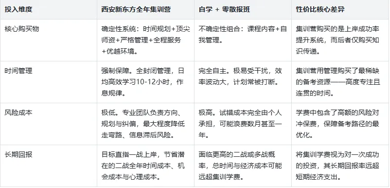在考研这场信息战与持久战中,一个决定性的选择是:如何将有限的时间、精力与预算,转化为最高的上岸成功率。对于目标明确、志在一战成硕的考生而言,西安新东方考研全年集训课程提供了一个经过系统验证的答案。它并非简单的课程打包,而是一项 战略性投资——通过整合顶级的教学管理、沉浸式的优越环境与贯穿始终的精细化服务,为你的考研之路铺设一条阻力最小、效率最高的高速通道。📍高性价比剖析:为什么全年集训是最经济的选择?