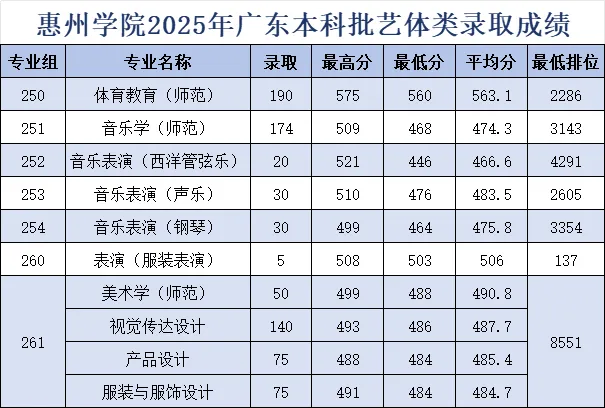 从录取综合分来看,体育类最高分575分、最低分560分,音乐类最高分521分、最低分446分,美术类最高分499分、最低分484分,表演类最高分508分、最低分503分。