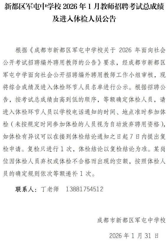 >新都区军屯中学校2026年1月教师招聘考试总成绩及进入体检人员公告