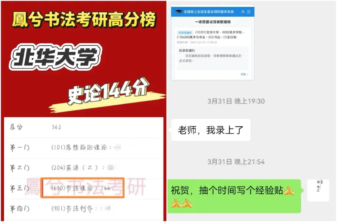 2026年北华大学美术学院招生书法硕士研究生5人(含推免2人)。初试专业科目为书法理论和书法作品评述。25年复试线为352分(国家线351),一志愿进入复试14人,录取9人,鳳兮学员3人录取,其中张同学书法理论144分(为本年度该校书法理论科目状元),林同学书法实践139分(为本年度该校书法实践科目状元),鳳兮书法考研学员取得了该校专业科目双状元的传奇。以下为鳳兮书法考研整理的相关资讯,供27年备考学生参考,本年度鳳兮书法考研开设北华大学书法史论全程课程(包含两门专业课),详情请加微信咨询。