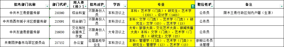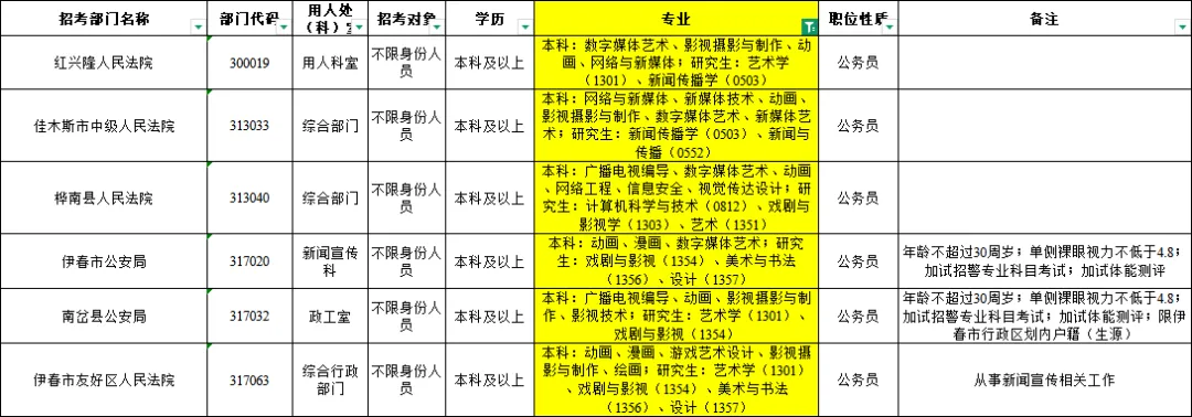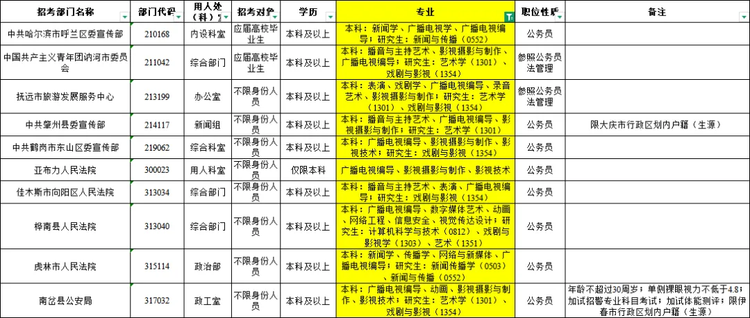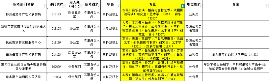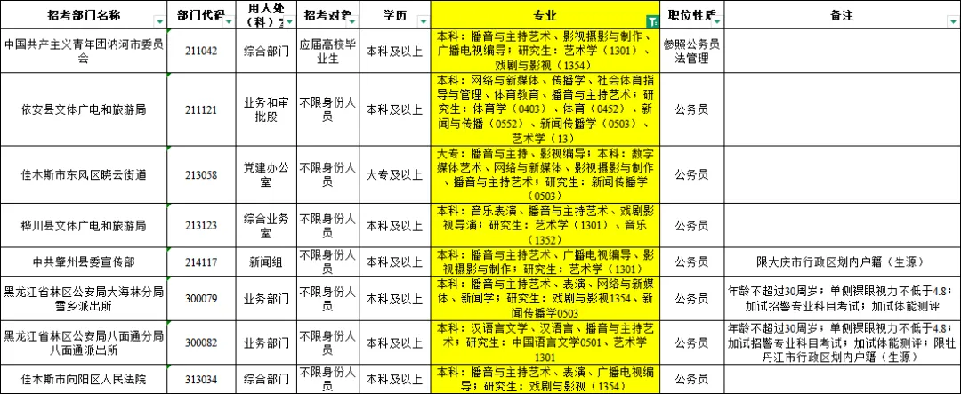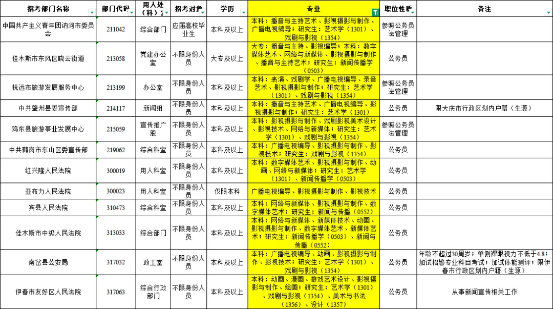 在黑龙江省2026年度各级机关考试录用公务员计划中,包括宣传部、公安局、法院、团委、文旅局、文学艺术界联合会、街道办等省市、县乡、综合执法类各级机关共计数十名额事业编制岗位需求传媒类专业。
