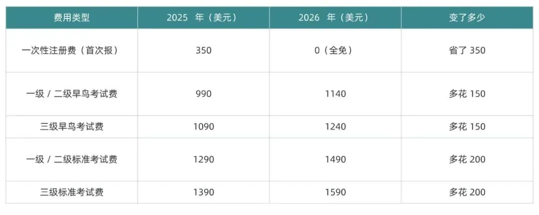 比如三级考生,2025 年没考过,2026 年补考,标准考试费从 1390 美元涨到 1590 美元,一次就多花 200 美元。