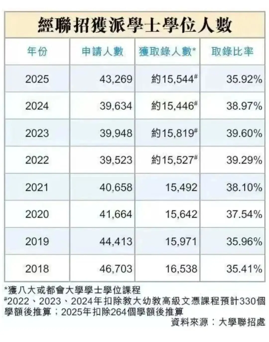 香港八大公立院校:平均录取率约40%(2025年日校考生达标率38.5%,基本持平)。