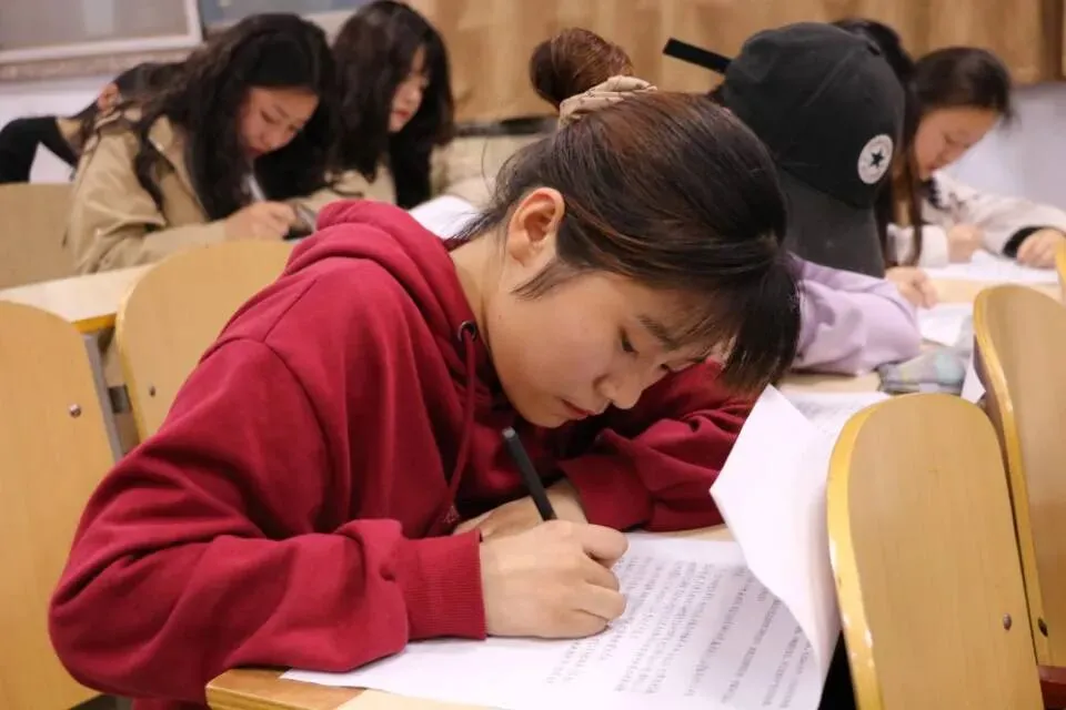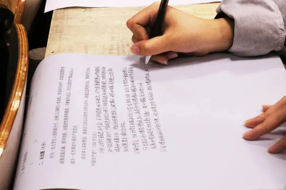 “笔和纸摩擦着的沙沙的声音,还有飘荡的淡淡的墨香,配合着考生们时而暂蹙的眉头,满是和谐却满是紧绷的氛围。时而翻纸的声响在其中荡起了涟漪,划破了这个氛围,打破了这个节奏,却也在笔尖的忙碌下恢复常态。”